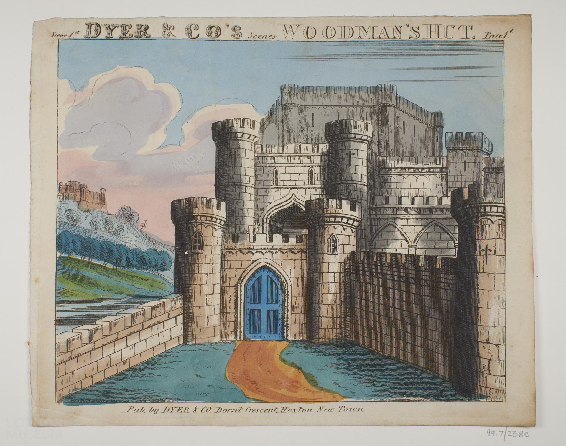 Coloured toy theatre scenery sheet, one of six items relating to the play 'Woodman's Hut'. Scene 1. Published by Dyer & Co. 13 Dorset Crescent Hocton New Town.