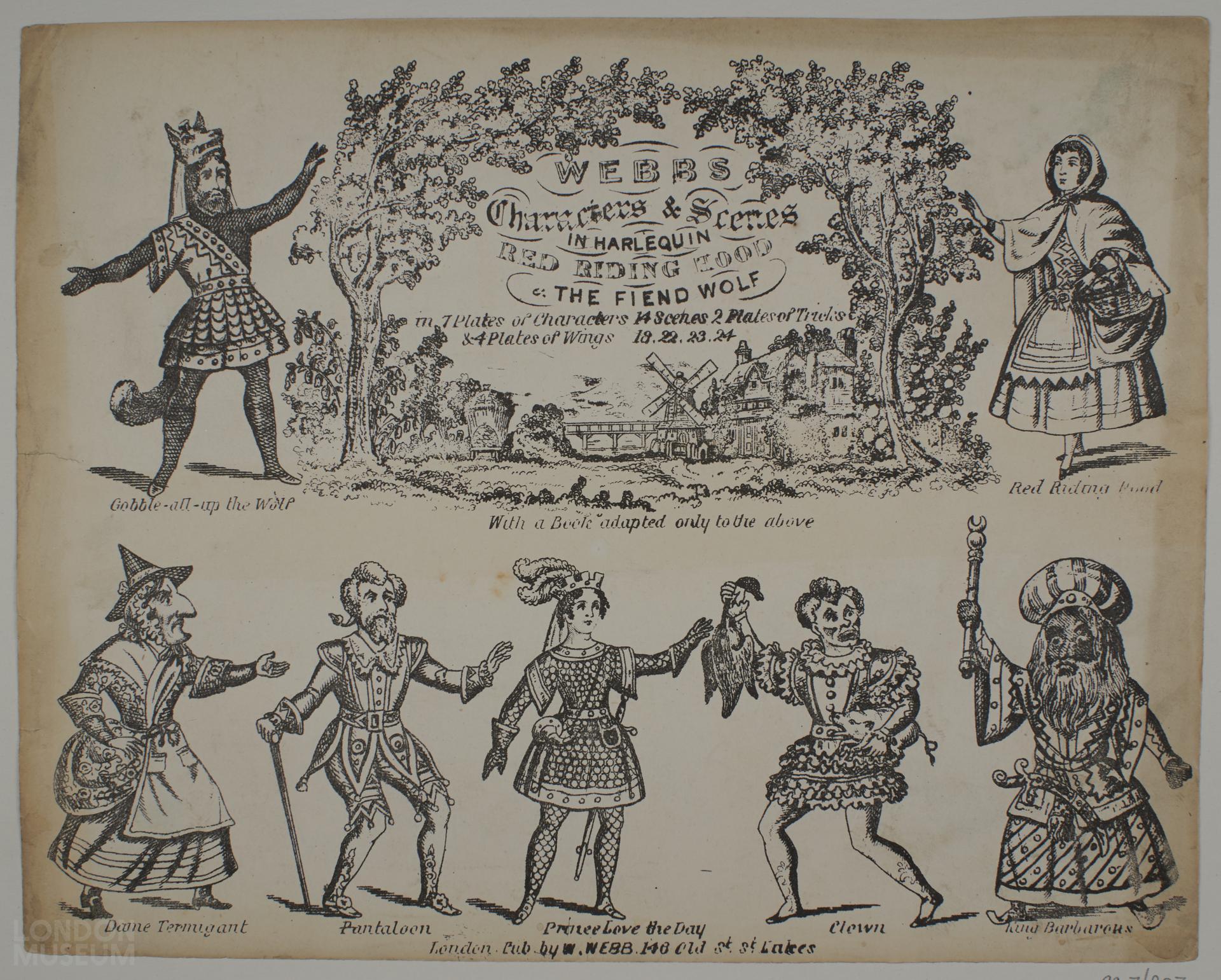 Toy theatre character sheet relating to the play 'Red Riding Hood & the Fiend Wolf', In 7 Plates of Characters, 14 Scenes, 2 Plates of Tricks & 4 Plates of Wings 18, 22, 23, 24. Published by W. Webb, 146 Old Street, St Luke's, London.