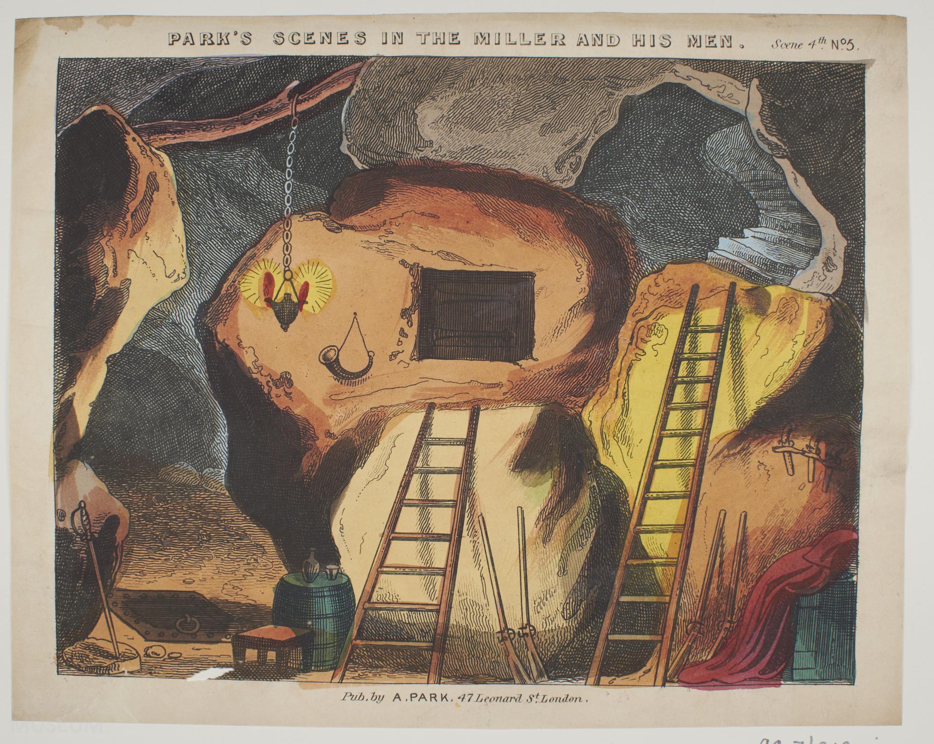 Printed colour scenery sheet titled 'Park's Scenes in The Miller and his Men' scene 4th, No 5.