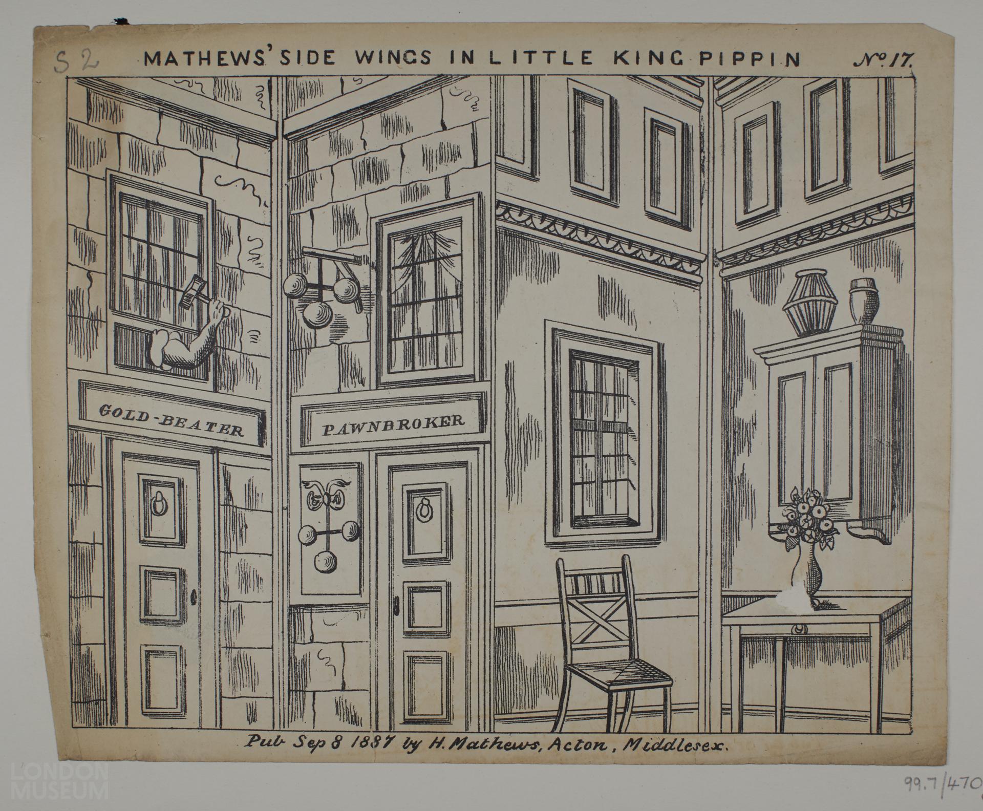Toy theatre scenery sheet, one of ten items relating to the play 'Harlequin and Little King Pippin'. No. 17. Published by H. Mathews Sep. 8th 1887, Acton, Middlesex.