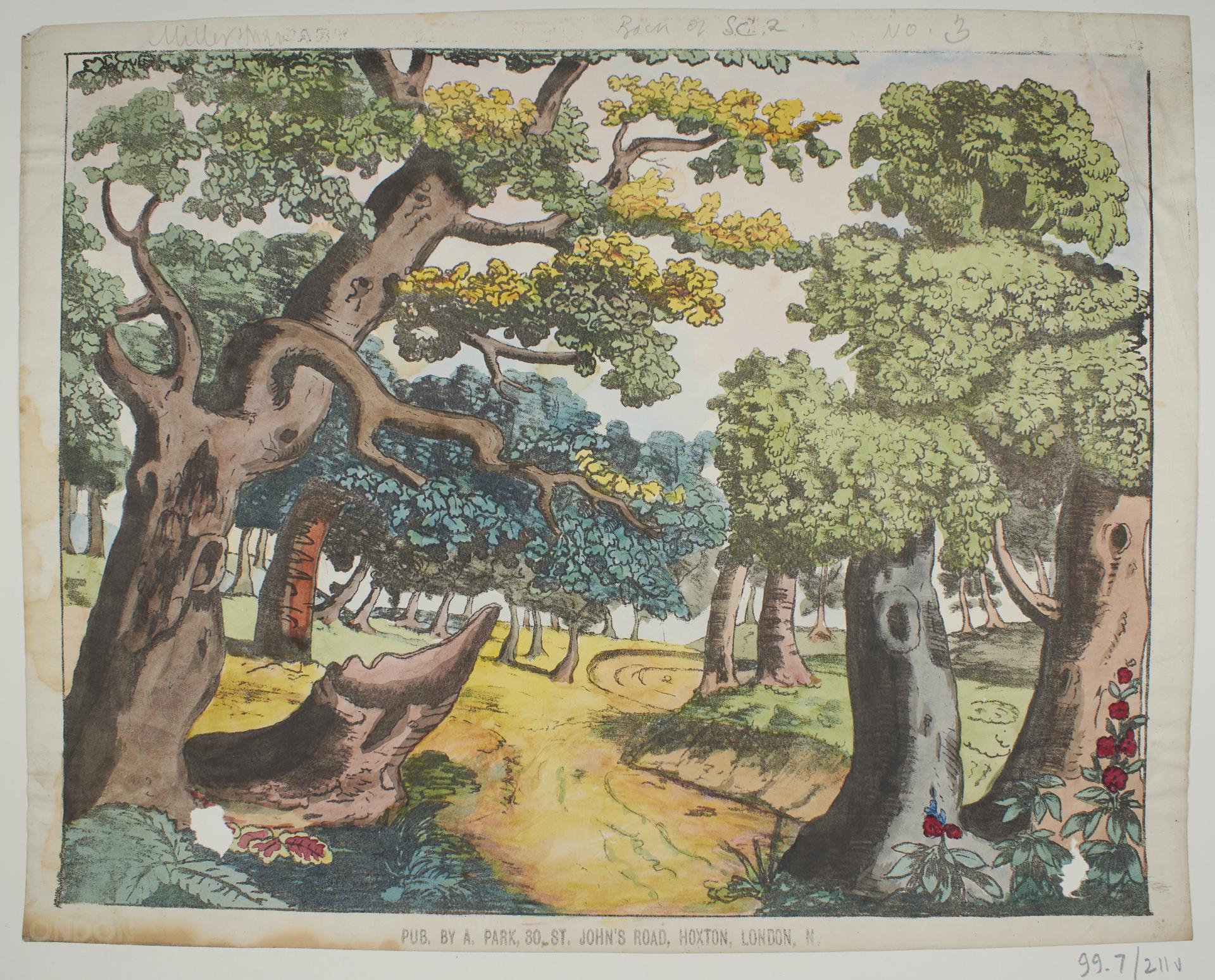 Printed colour scenery sheet, of parkland with trees.