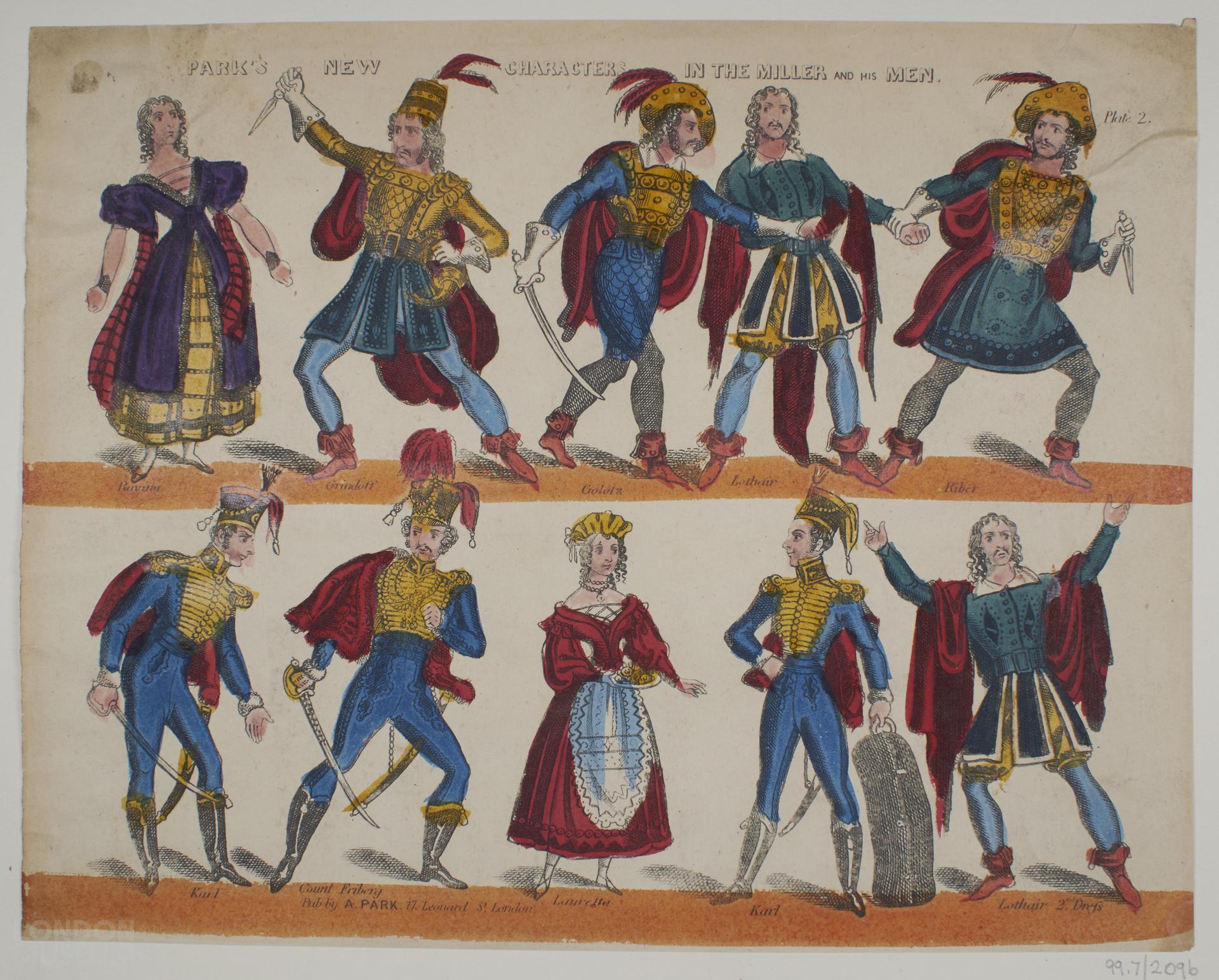 Printed colour character sheet titled, 'Park's New Characters in the Miller and his Men'. Plate 2.