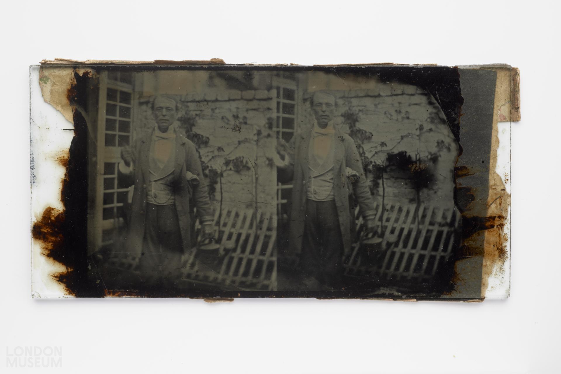 Stereoscopic ambrotype, two portraits side by side. Masked with decorative coloured paper only on reverse. Image depicts a man standing in a garden holding a watering can, he wears glasses. The same man appears in IN16454. Made in the 1850s and 60s by William Henry Stratton, an amateur photographer who lived in South London.