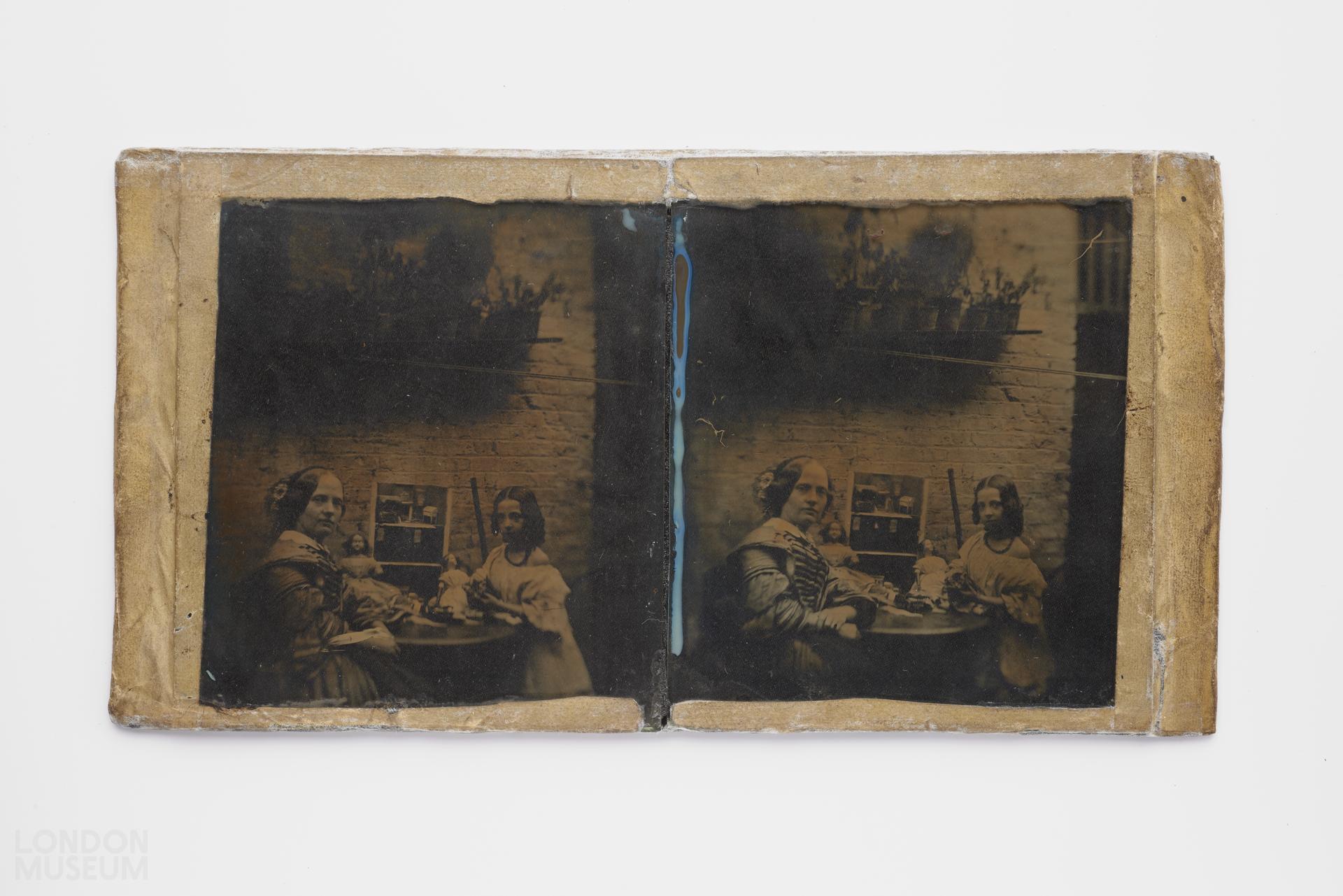 Stereoscopic ambrotype, two portraits side by side. Masked with white paper and sealed on reverse. Image depicts a woman and young girl sat at a table and looking at the camera. They both hold dolls and on the table a doll's house is seen. They appear to be outside as they have a background of brickwork with hanging plants. The same woman and girl appear in IN16455. Made in the 1850s and 60s by William Henry Stratton, an amateur photographer who lived in South London.