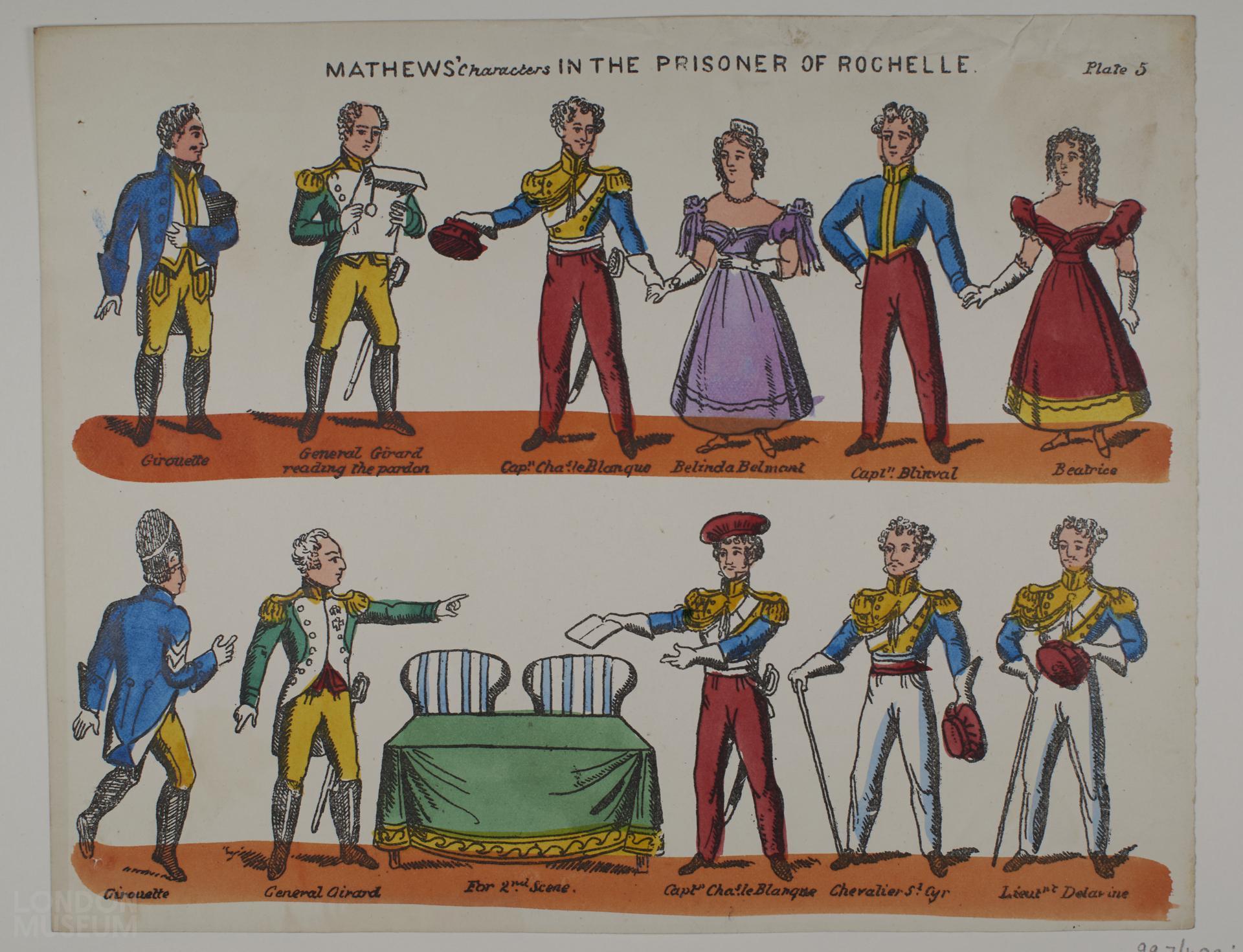 Toy theatre character sheet for the juvenile drama 'Prisoner of Rochelle' based on plates originally published by Skelt. Plate 5. Published by H. Mathews on 31st October 1886.