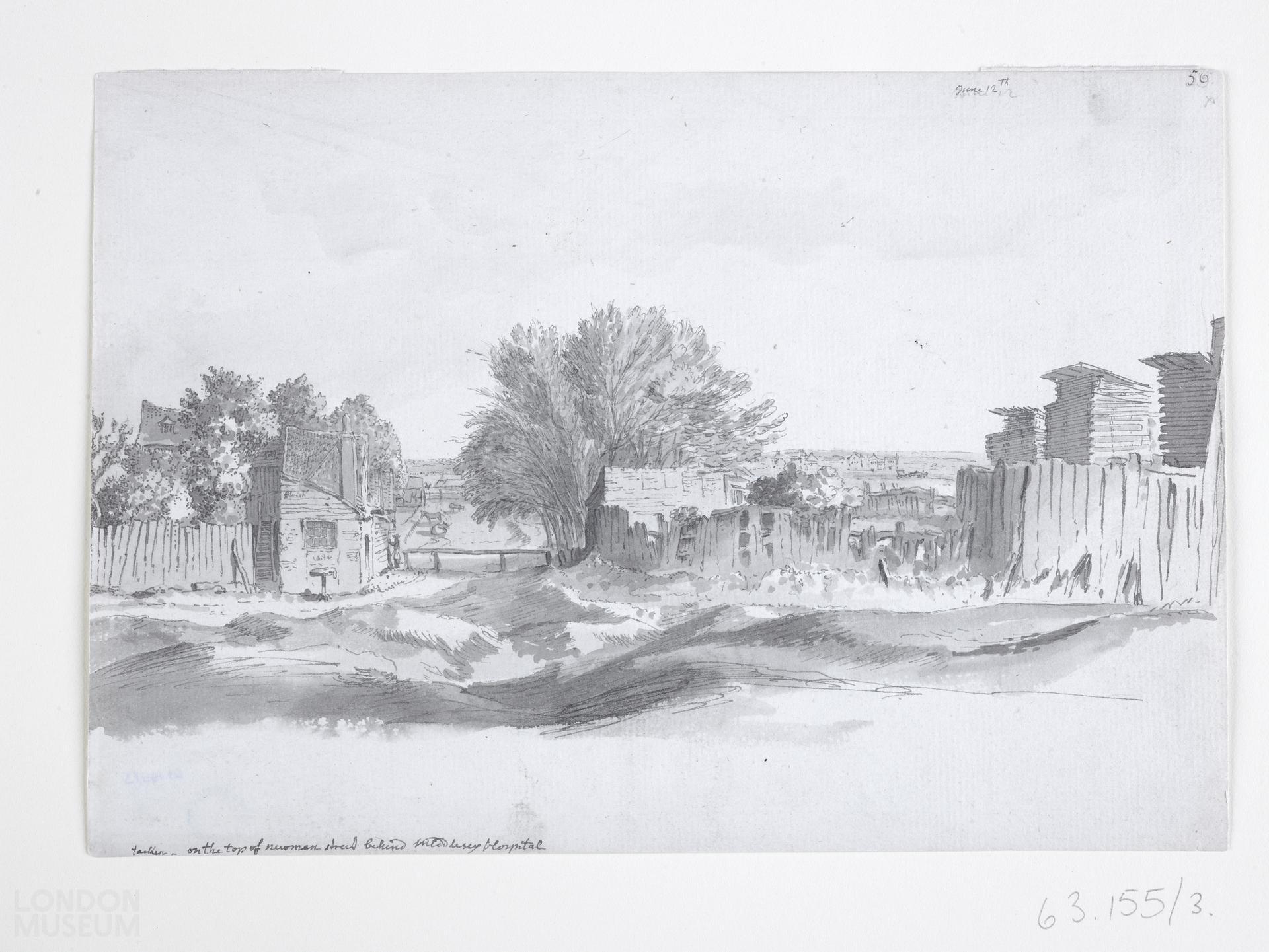 Taken on the top of Newman Street behind Middlesex Hospital, a timber yard can be seen in the foreground. Inscribed on the back 4 Feb 95 [poss by the purchasor, who acquired these leaves after Grimm's death in 1774 ?]. The leaf is from a sketch book and is inscribed June 12th, no. 50 in the top right hand corner. This item also bears the collector's mark of Sir Bruce Ingram (editor of the Illustrated London News) who died in 1963. According RM Clay, Samuel Hieronymus Grimm (London, 1942), these sketches come fro a sketch book with a title page 'Studies from Mature by S. H. Grimm vol XII - begun ye 8th of July 1771, finished ye 20th September 1772.' (p. 68). There are other leaves in the Guildhall, Prints & Drawings Department.