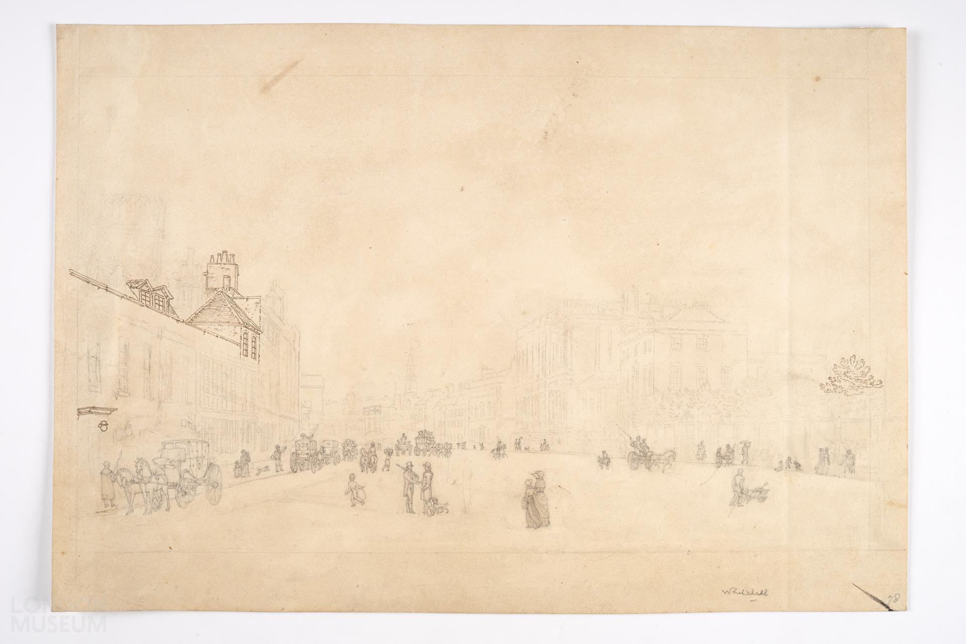 Unfinished sketch of Whitehall looking north, with pencil outline of the street and some ink, c. 1810.