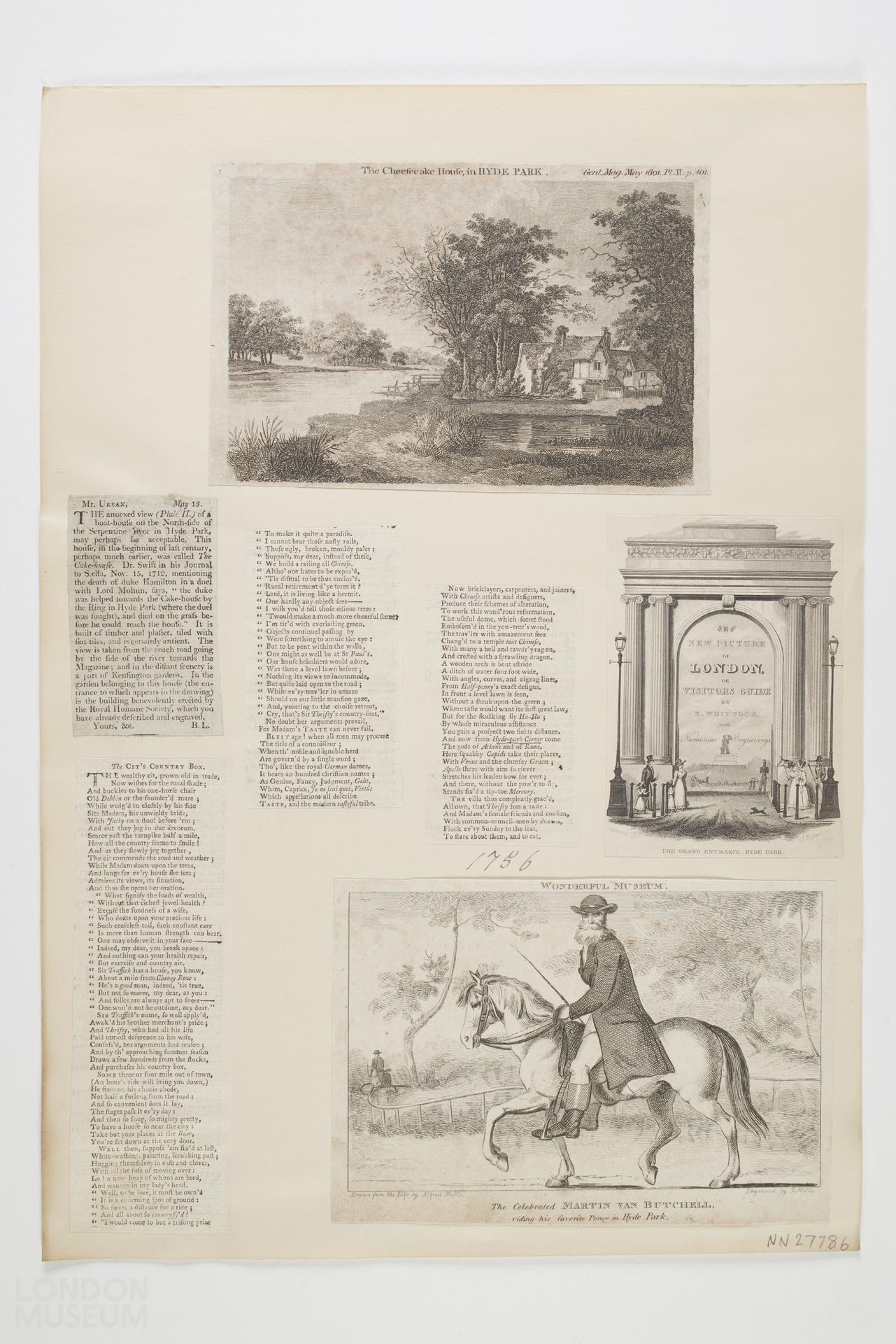 The first print shows a view of a cottage in Hyde Park titled 'The Cheesecake House, in Hyde Park' from May 1801. The second print shows an archway into Hyde Park framing the statue of Achilles. Titled 'The New Picture of London, or Visitors Guide by N.Whittock'. Drawn by 'Seymour' and engraved by 'J.Rogers'. The third print is of a male figure riding a horse and is titled 'The Celebrated Martin Van butchell, riding his favorite Poney in Hyde Park'. The newspaper cuttings relate to the Cheesecake or Cake House in Hyde Park and a poem titled 'The Cit's Country Box'.