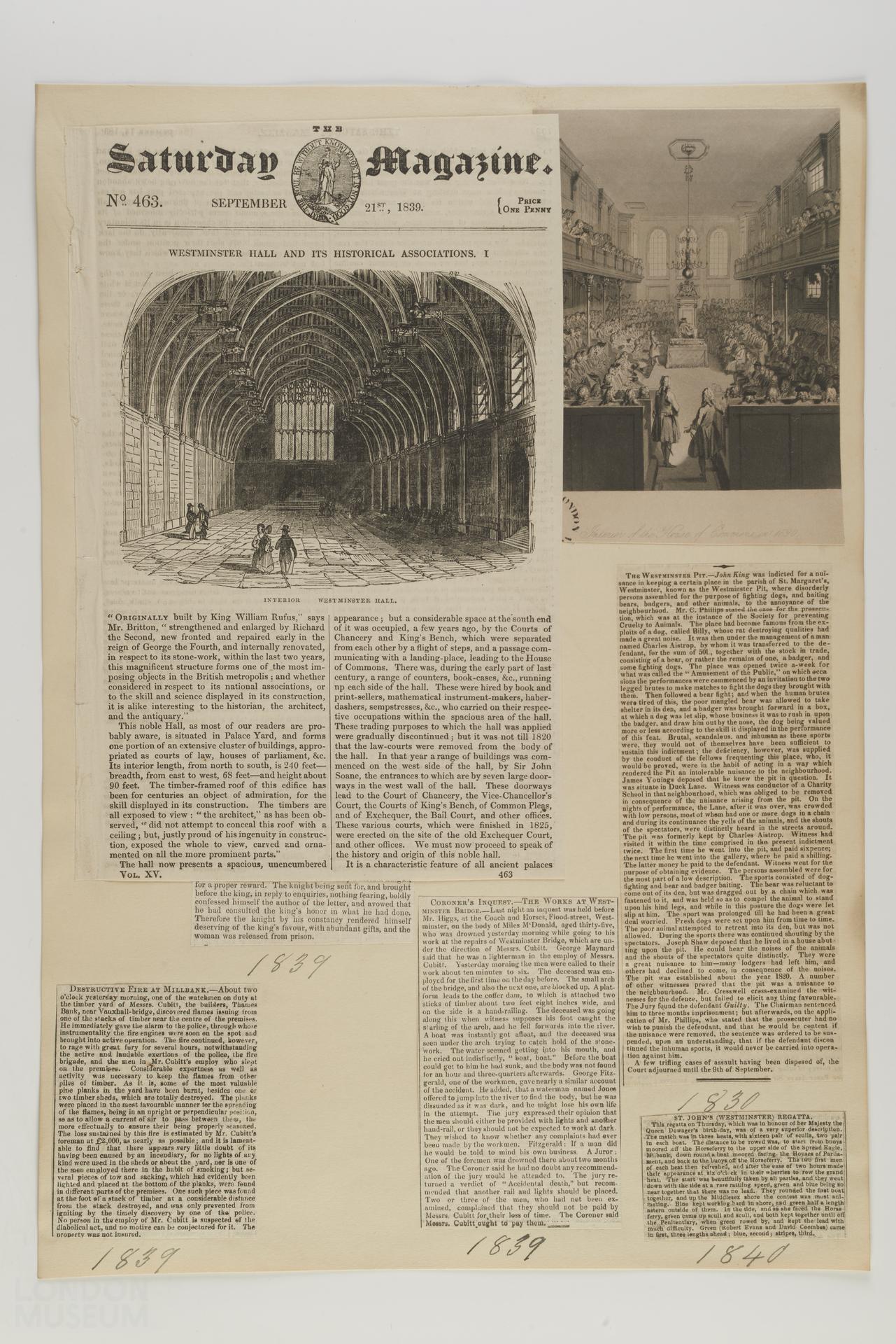 Five newspaper cuttings. 1) A possible continuation from the magazine cutting. 1839 handwritten in ink on paper support below. 2) Regarding a destructive fire at Milbank. 1839 handwritten in ink on paper support below. 3) Regarding a coroner's inquest into the works at Westminster Bridge. 1839 handwritten in ink on paper support below. 4) Regarding Westminster Pit. 1830 handwritten in ink on paper support below. 5) Entitled, 'St John's (Westminster) Regatta'. 1840 handwritten in ink on paper support below. Also a double sided printed page of 'The Saturday Magazine'. No. 463 September 21st 1839. Also an engraving entitled, 'Interior of the House of Commons in 1690'.