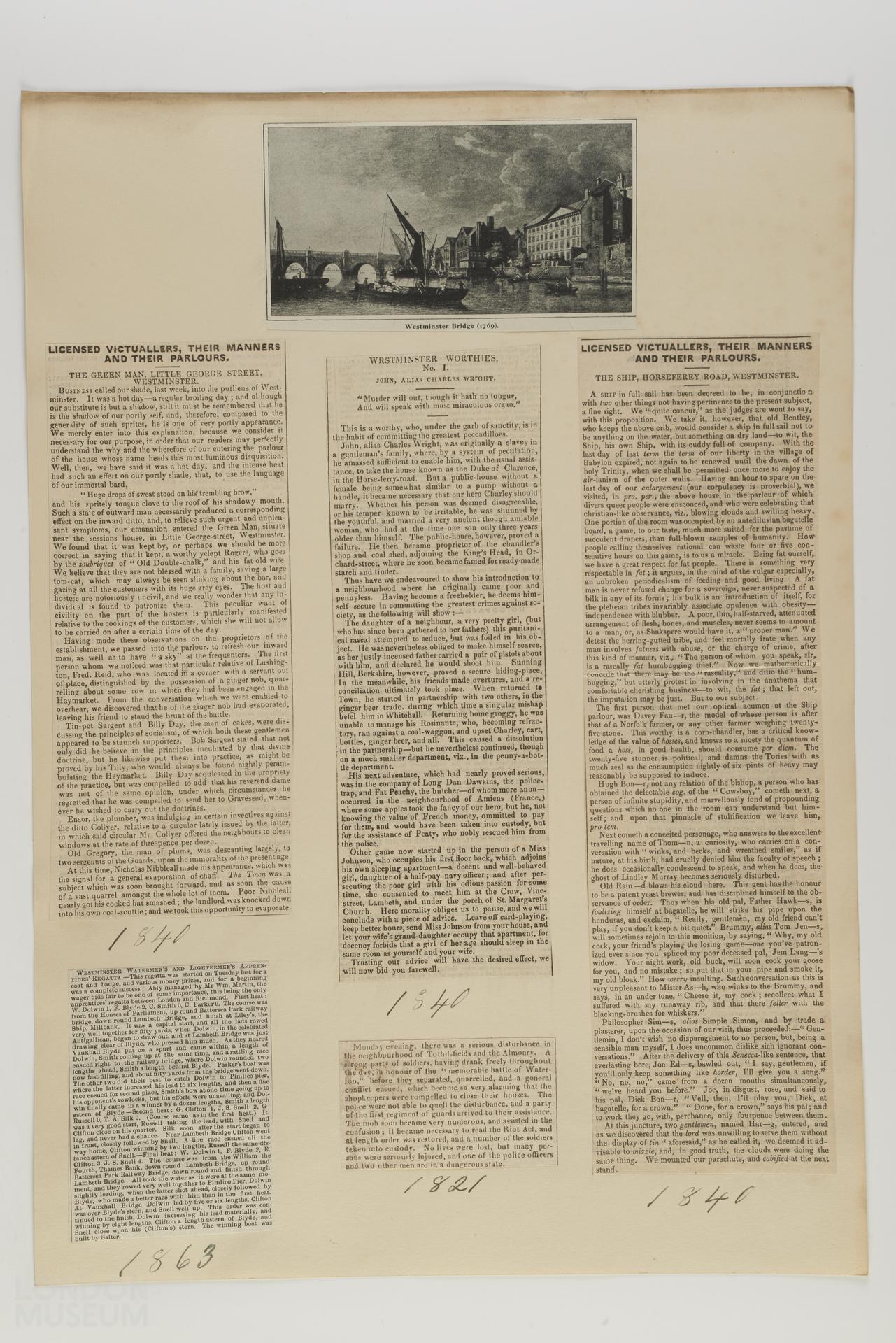 Five newspaper cuttings. 1) Entitled, 'Licensed Victuallers, their Manner and their Parlours, The Green Man, Little George Street, Westminster'. 1840 handwritten in ink on paper support below. 2) Regarding Westminsters Watermen's and Lantermen's apprentices' regatta. 1863 handwritten in ink on paper support below. 3) Entitled, 'Westminster Eorthies No. 1 John, alias Charles Wright'. 1840 handwritten in ink on paper support below. 4) Regarding a drunken mob. 1821 handwritten in ink on paper support below. 5) Entitled, 'Licensed Victuallers, their Manner and their Parlours, The Ship, Horseferry road, Westminster'. 1840 handwritten in ink on paper support below. Also an engraving, possibly a photolithograph, entitled, 'Westminster Bridge (1769)'.