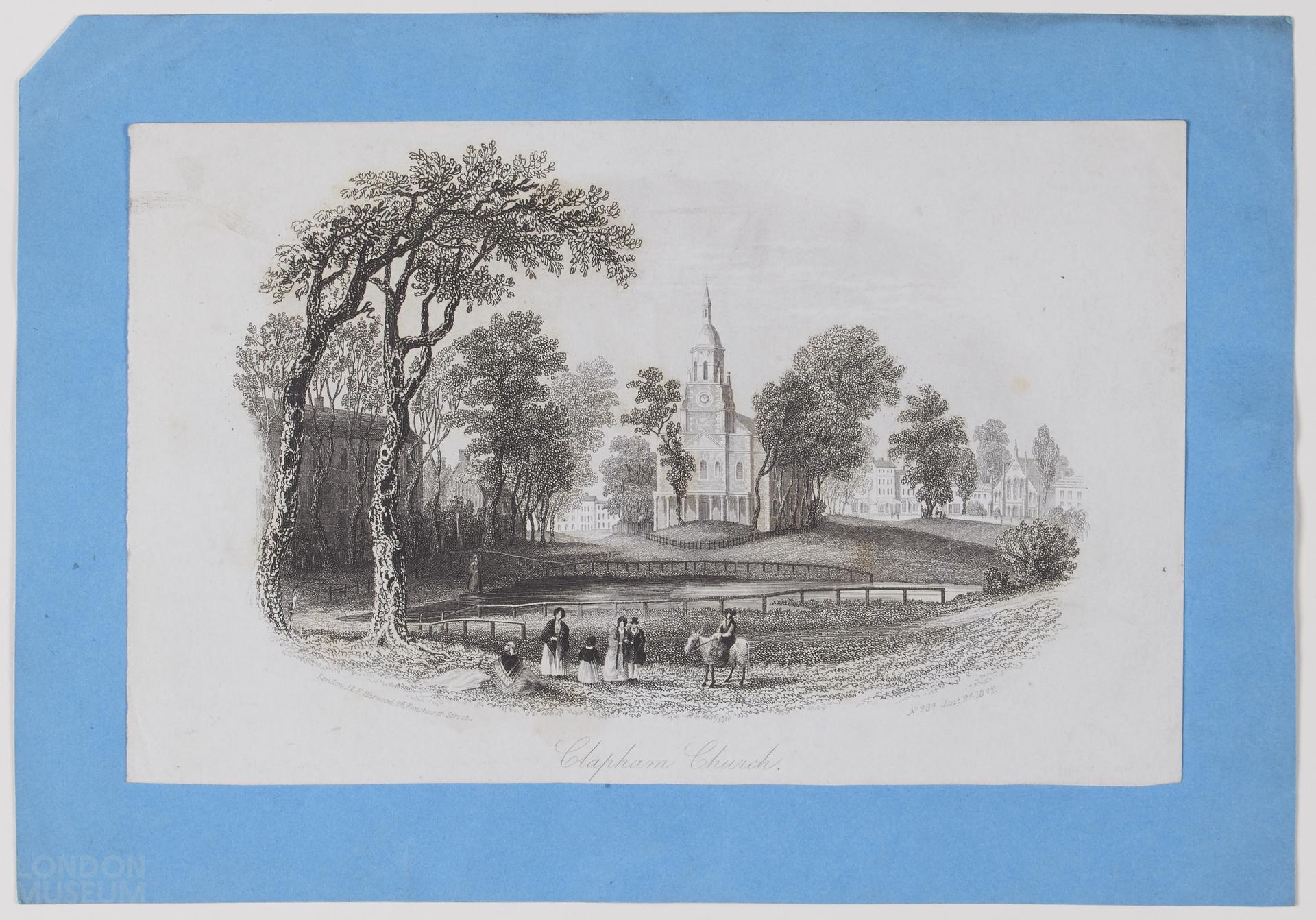 View of Clapham Church, with people and a horse in the foreground.