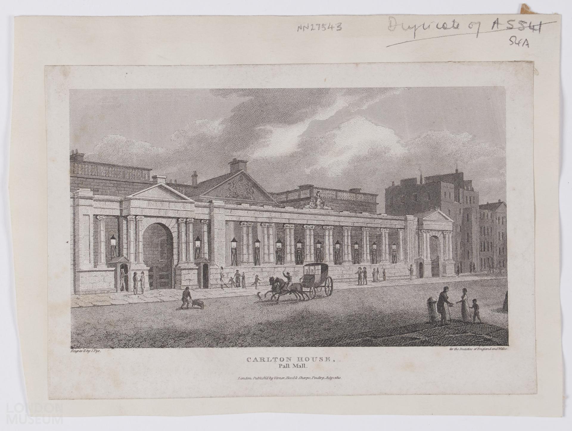 Exterior of Carlton House, Pall Mall, St James's. Produced for the 'Beauties of England and Wales, (1801-16)'.