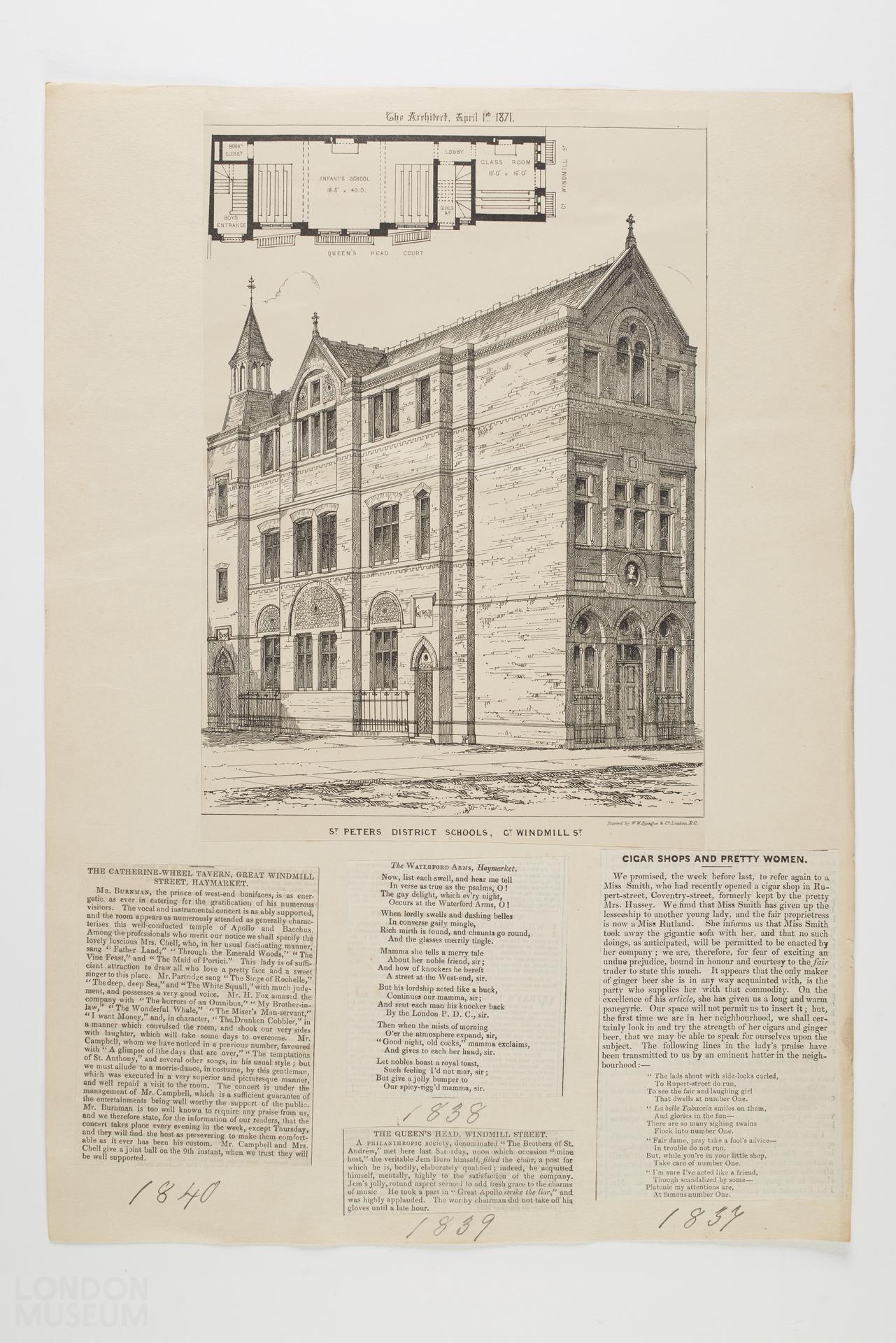 Four newspaper cuttings that relate to Great Windmill Street and Haymarket, reproduction of a print titled: 'St. Peters District Schools, Gt Windmill St.'.