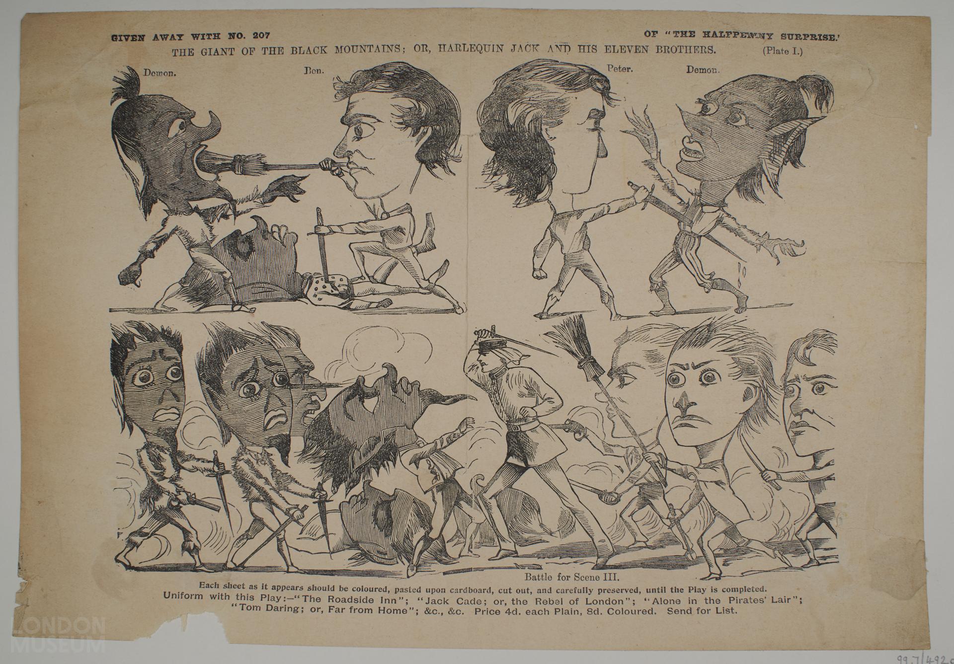 Toy theatre character sheet for the juvenile drama 'The Giant of the Black Mountains or Harlequin Jack and his Eleven Brothers' published by Edwin J. Brett and distributed with his boys penny dreaful magazine 'The Boys of England'. Plate I.