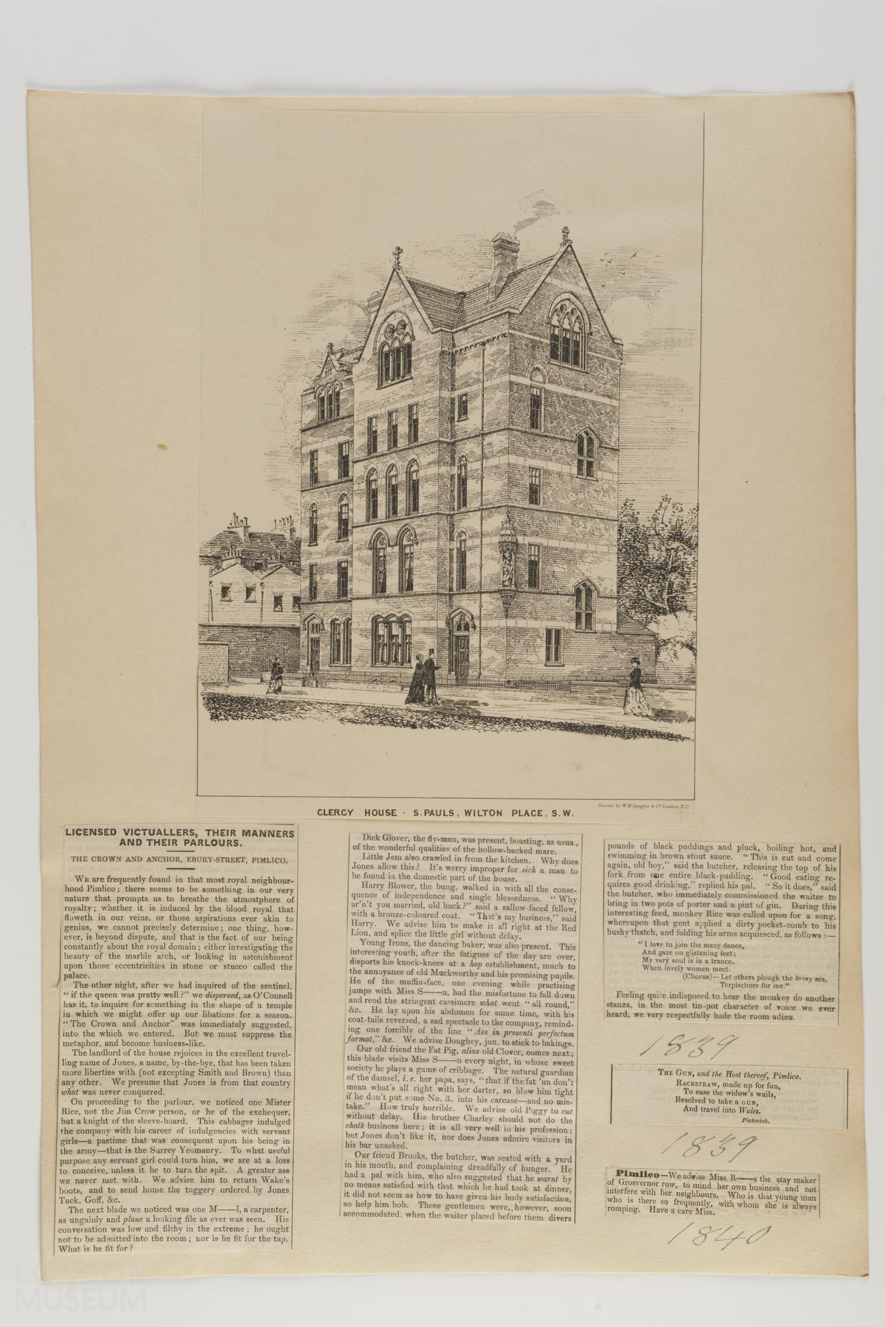 Reproduction of an etching entitled "Clergy House, S. Pauls, Wilton Place, S. W.", which shows the exterior of a building and the street next to it, with the rear of some terraced houses visible in the background. Below are adhered five newspaper cuttings, three of which are from the same article. The first is entitled "Licensed Victuallers, Their Manners and Their Parlours. The Crown and Anchor, Ebury-Street, Pimlico", and gives information about visiting this establishment. Below this article "1839" is written in ink. The second article is a poem, with "1839" written below in ink. The third article gives behavioural advice to "the stay maker of Grosvenor Row" and has "1840" written below in ink.