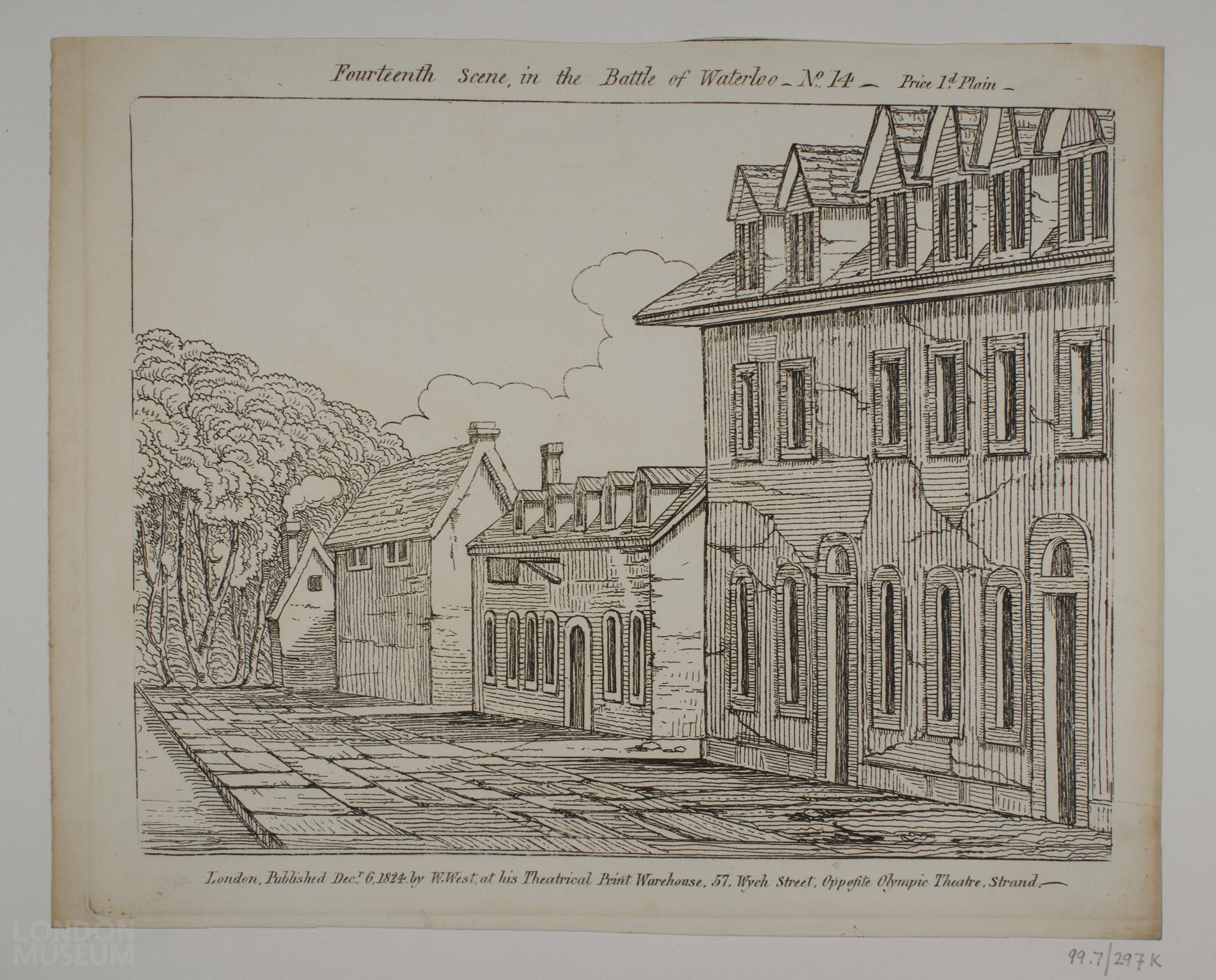 Uncoloured scenery sheet, titled 'Fourteenth Scene, in the Battle of Waterloo'.