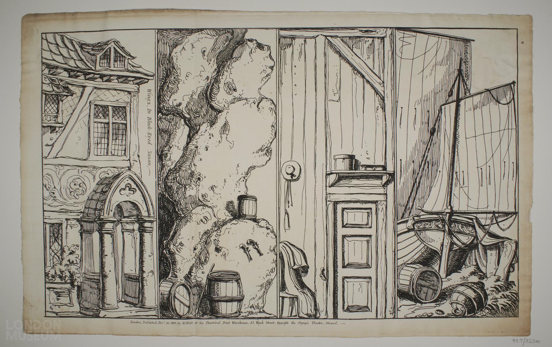 Toy theatre scenery sheet relating to the play 'Black Eyed Susan or All in the Downs as performed at the Surrey Theatre.' Wings. Published by William West, 57 Wych Street, Strand, London, December 16th 1829.