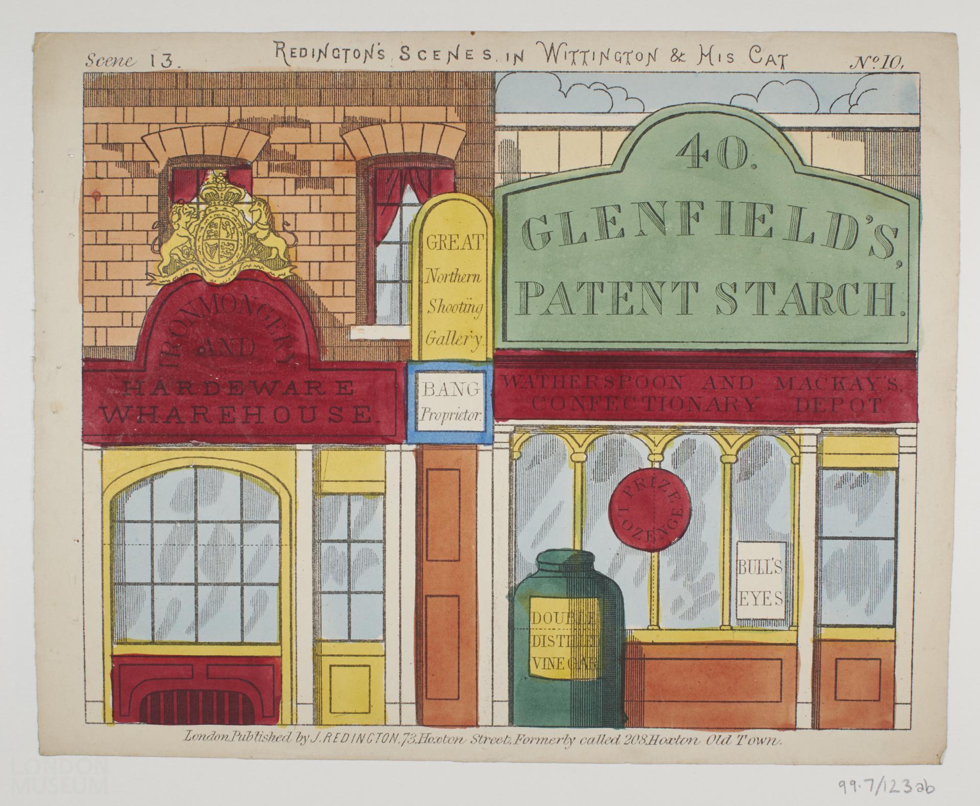 Coloured toy theatre scenery sheet, one of fourty items relating to the play 'Whittington and his Cat'. Scene 13, No. 10. Published by J.Redington 208 Hoxton Old Town.