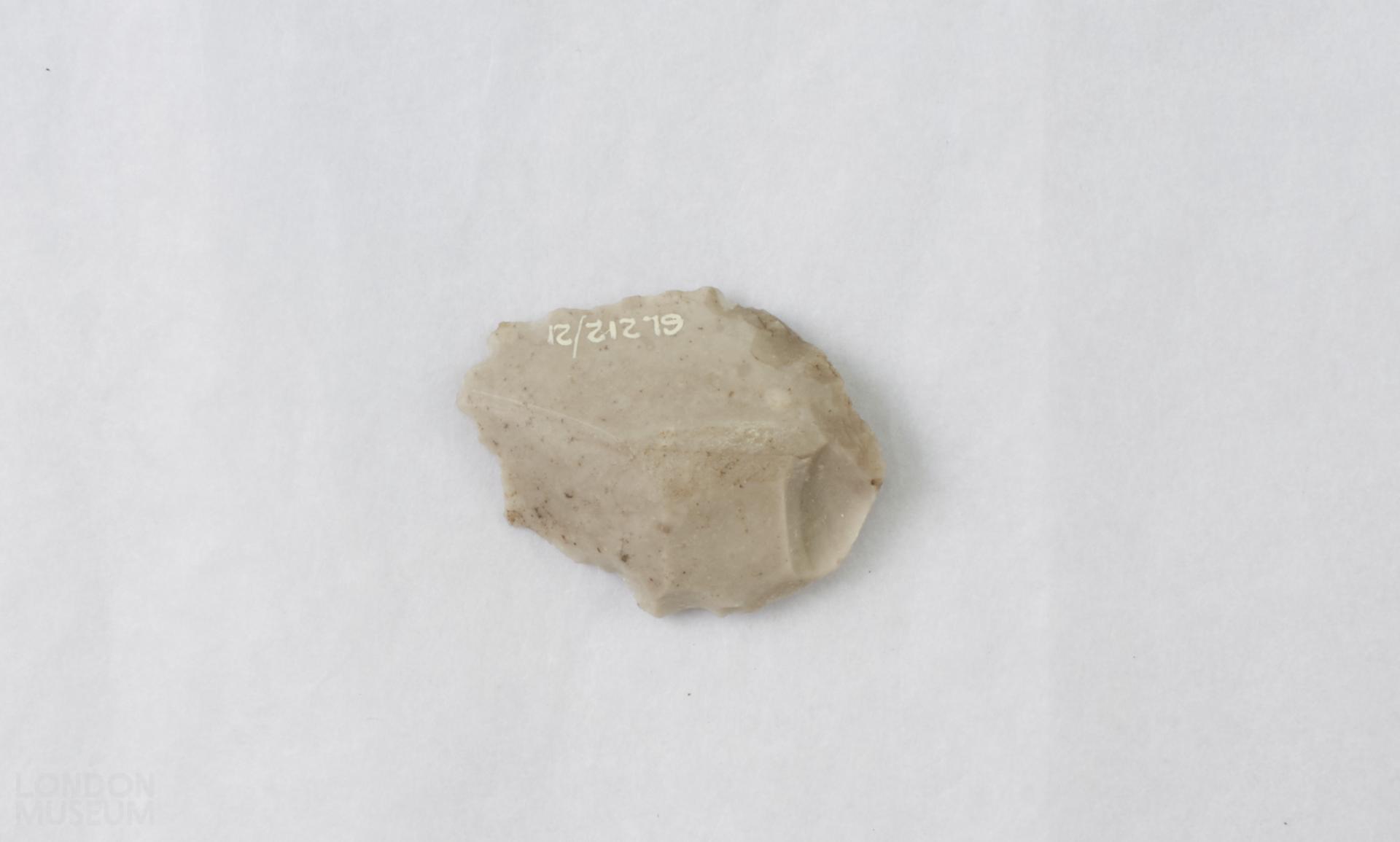 Flake of pale grey flint, possibly a chip from a polished axe.
