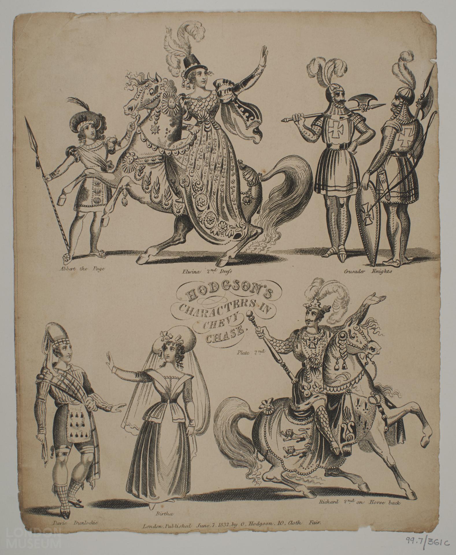 Toy theatre character sheet, one of eleven items relating to the play 'Chevy Chase'. Published by O Hodgson, 10 Cloth Fair.