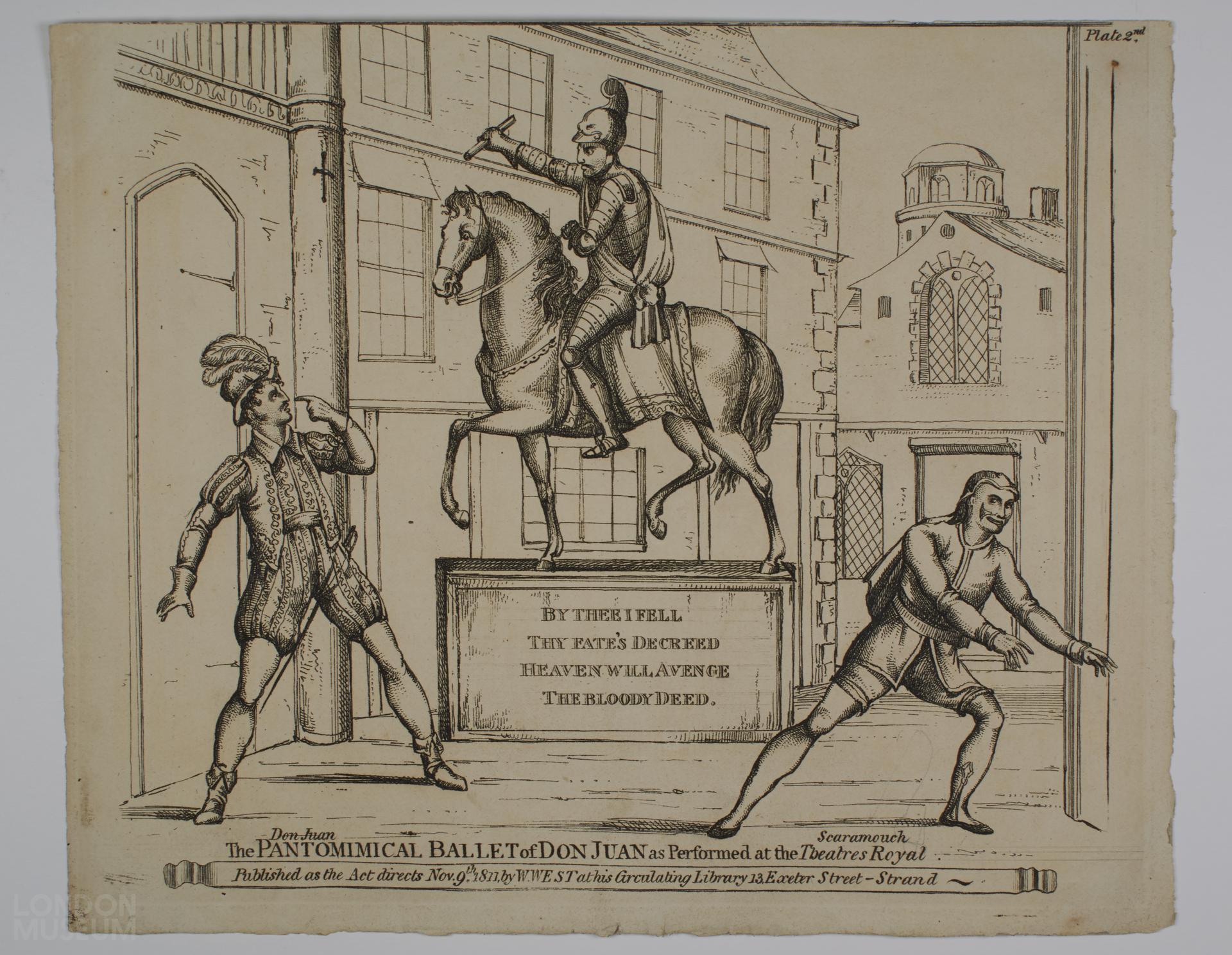 The Pantomimical Ballet of Don Juan as performed at the Theatres Royal. Character and scenery sheet, 'by thee I fell thy fate's decreed heaven will avenge, the bloody deed'.
