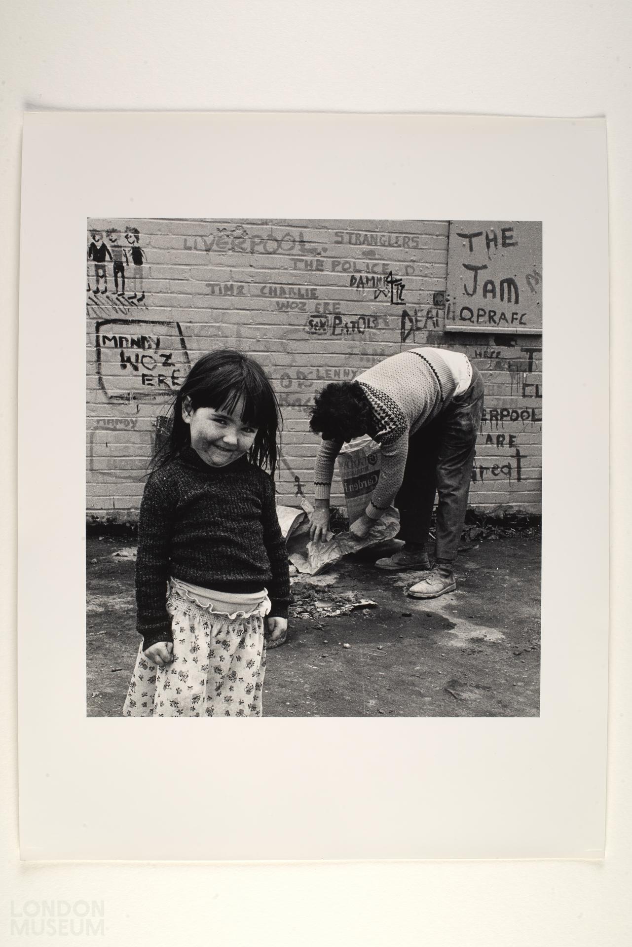 A young girl posing for the camera stood on rough ground infront of a brick wall in what might be a play area. Children's graffiti is written on the wall including names of bands and football teams including The Jam, the Sex Pistols, the Police.
