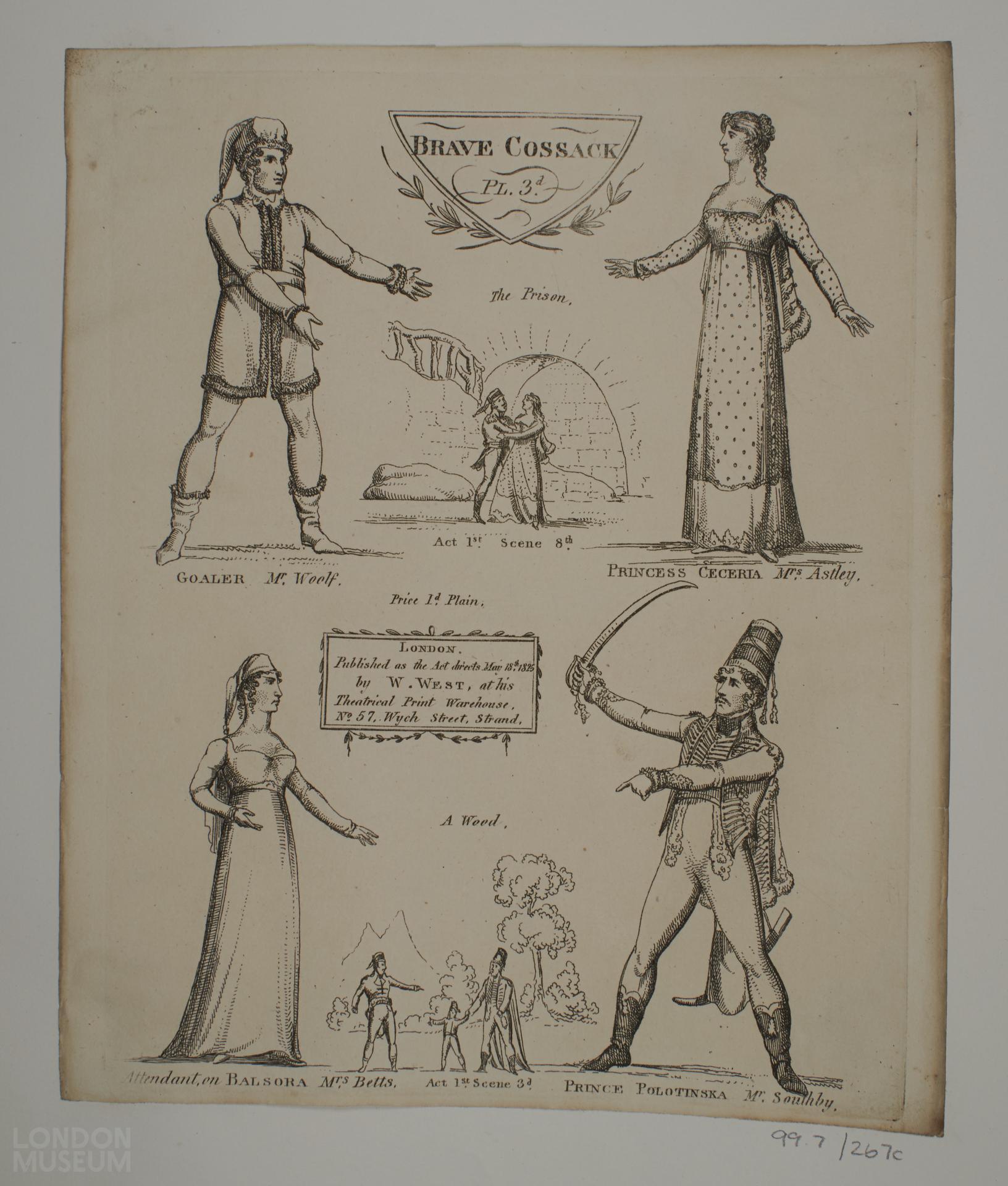Complete set of four engraved uncoloured character plates numbered 1-4 for the juvenile play 'The Brave Cossack'. Published in 1825, the first plate is printed 'Principal Characters in the Grand Russian Equestrian Spectacle called the Brave Cossack, or the Secret Enemy as performed at Astley's Amphitheatre, Westminster Bridge.'