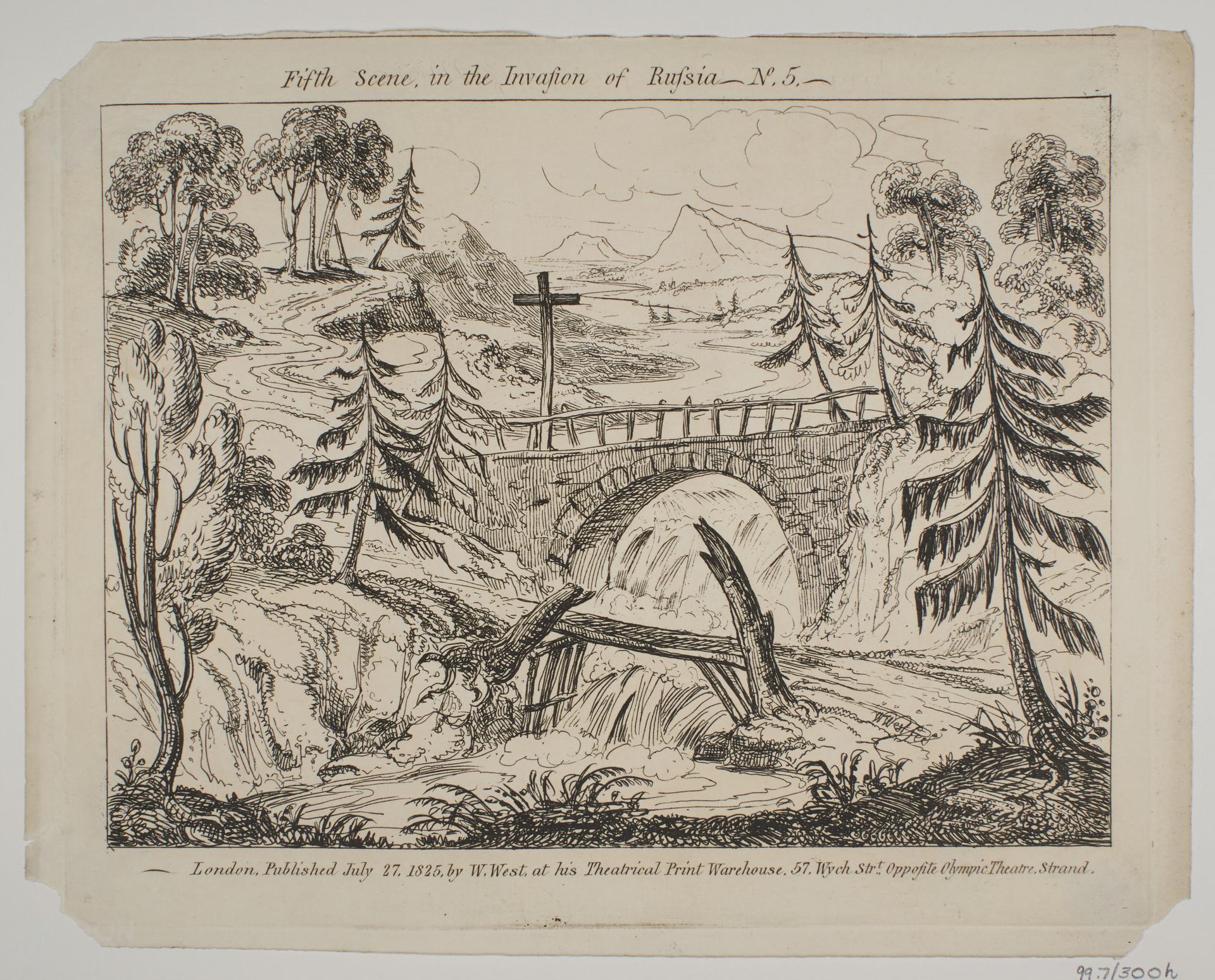 Toy theatre scenery sheet relating to the juvenile drama 'Bonaparte's Invasion of Russia', Fifth Scene, No. 5. A play originally performed at the Royal Amphitheatre, Westminster Bridge'.
