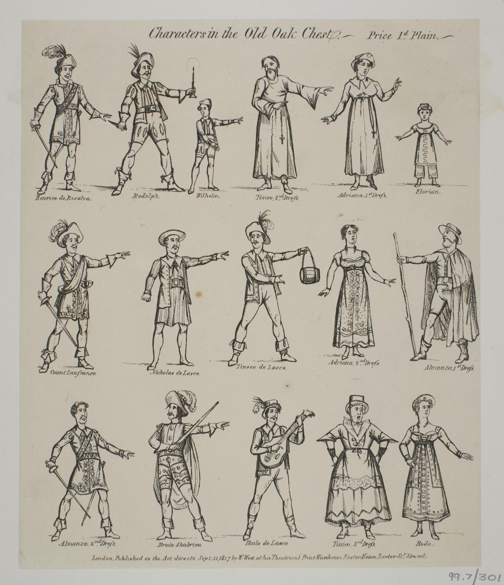 Toy theatre character sheet relating to the juvenile drama 'The Old Oak Chest'. Published by W. West, Exeter House, Exeter Street, Strand, London.