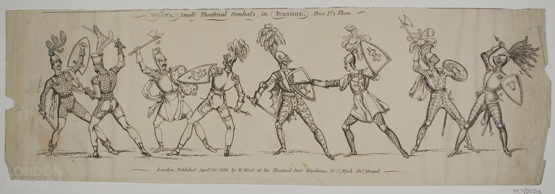 Theatrical portrait combat sheet relating to the juvenile drama 'Ivanhoe or the Jew of York', Published by W. West, No. 57, Wych Street, Strand.