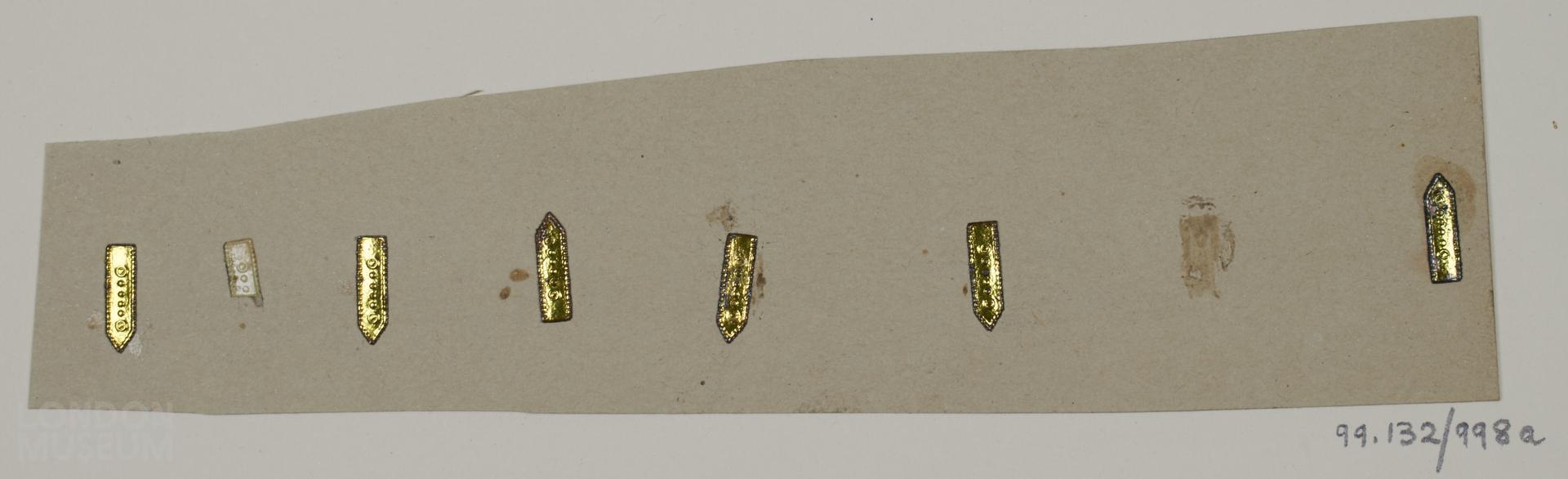 Tinsel ornament samples attached to three strips of paper. The pre-stamped ornaments relate to dress accessories and would be used to embellish theatrical tinsel portraits. Sheet 'a' comprises a strip with six gold metal foil belt tabs, 'b' has two applied gold tinsel braces and 'c' comprises a paper package with two applied silver metal epaulettes.