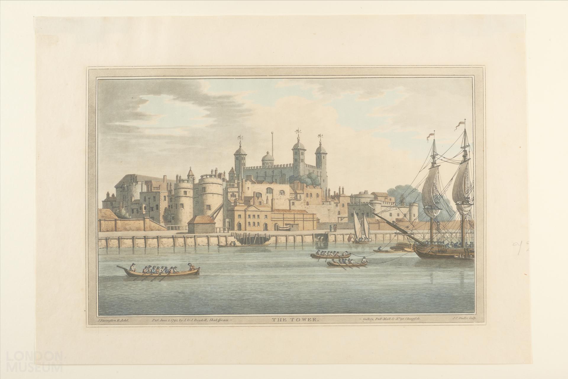 View of the Tower of London from the river. From 'A History of the River Thames', J. & J. Boydell, London: 1793-96.