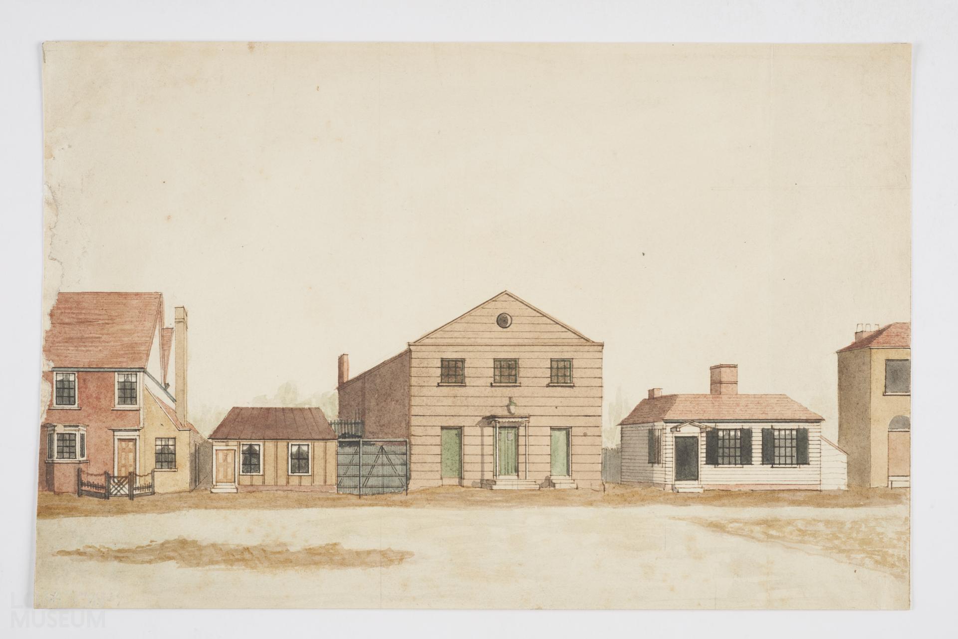 View of a street with four houses. See Z5889 for initial sketch. Unsigned but similar to other possible works by Tomkins.
