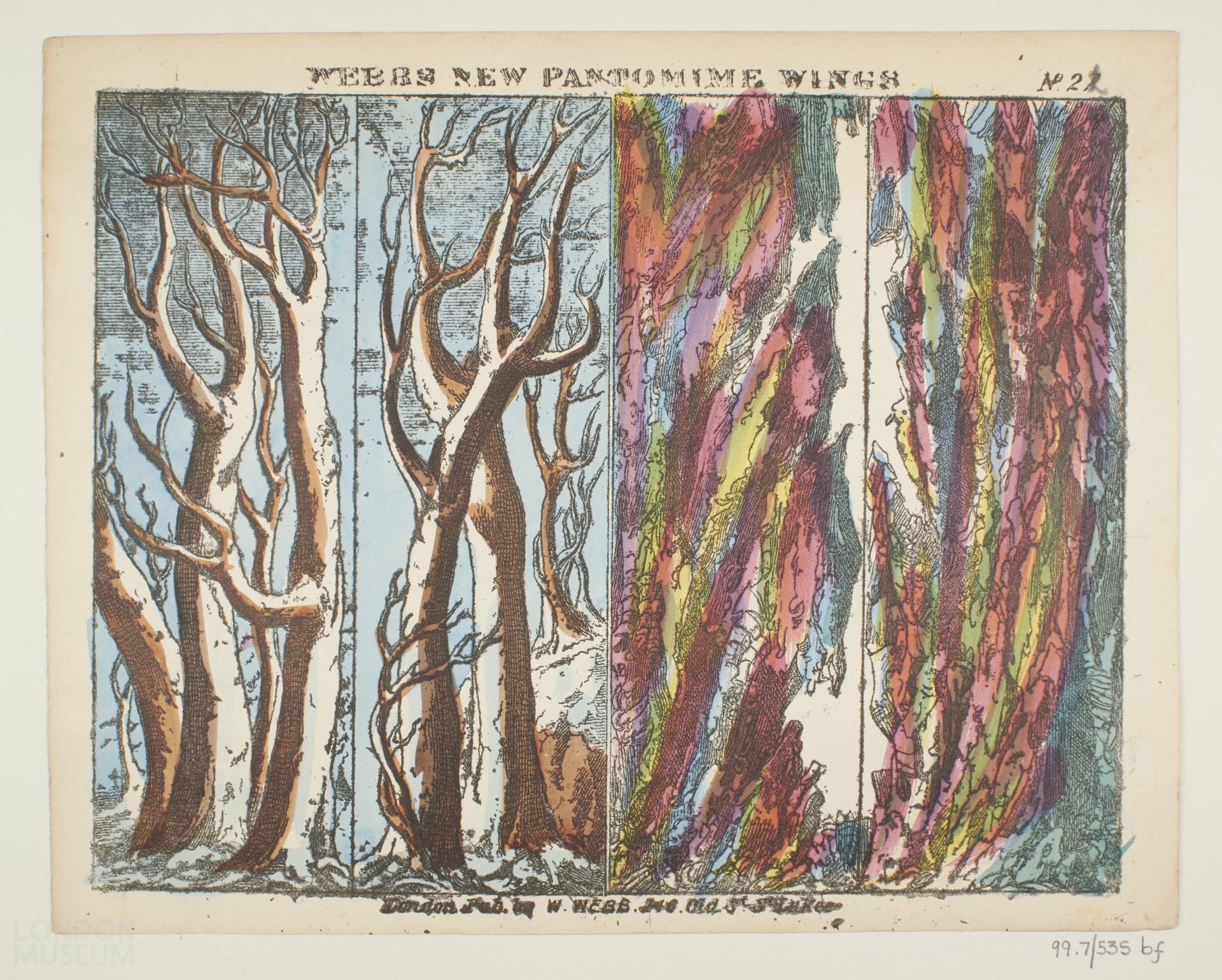 Toy theatre scenery sheet of pantomime wings, No. 22 (21 is written over the top). Published by W. Webb, 246 Old Street, St Luke's, London, for use with a variety of plays.