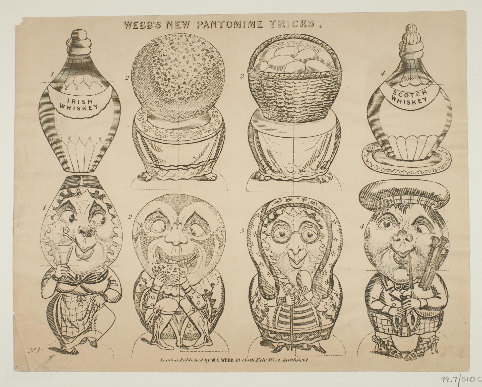 Toy theatre character sheet, 'Webb's New Pantomime Tricks'. No. 1. Published by W.C. Webb, 19 Cloth Fair, West Smithfield.