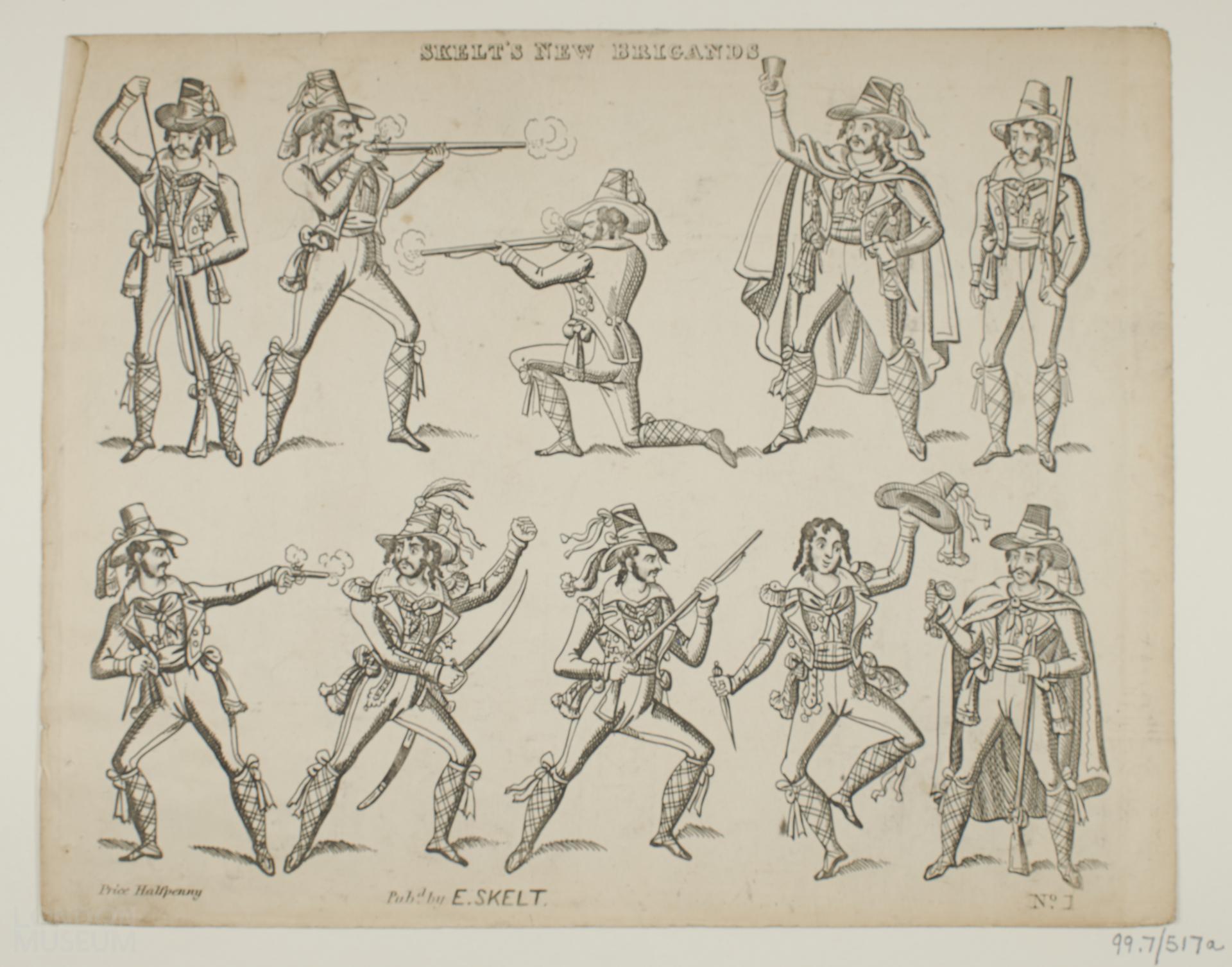 Toy theatre character sheet marked 'Skelt's New Brigands No 1'. Price 1/2d.