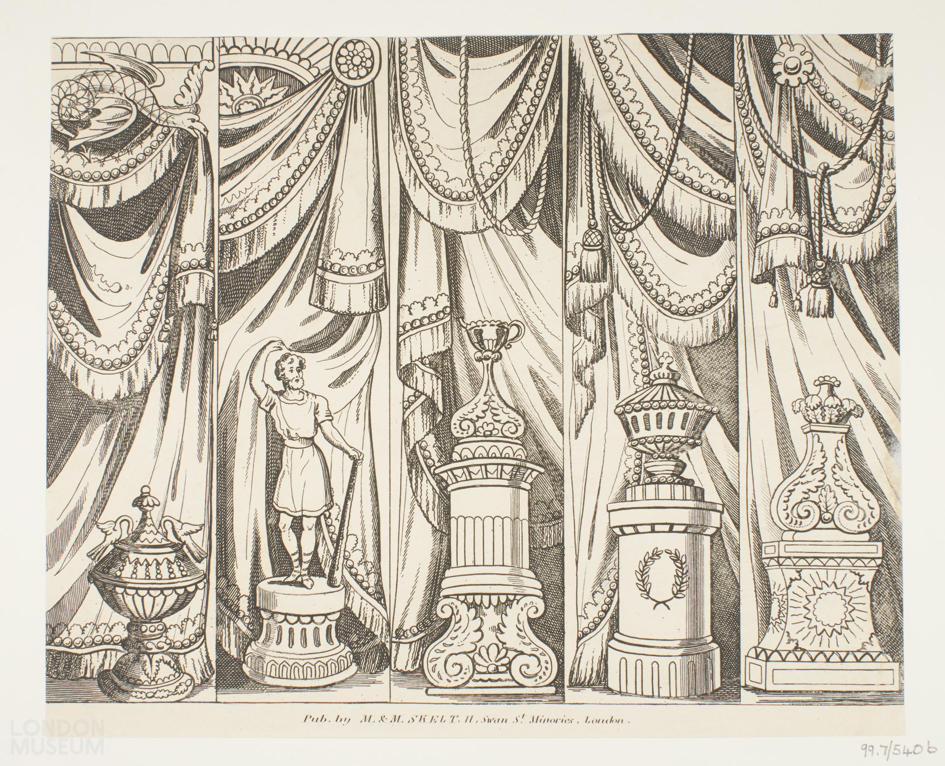 Toy theatre scenery wings sheet suitable for use with any play. Published by M & M Skelt, 11 Swan Street, Minories, London.