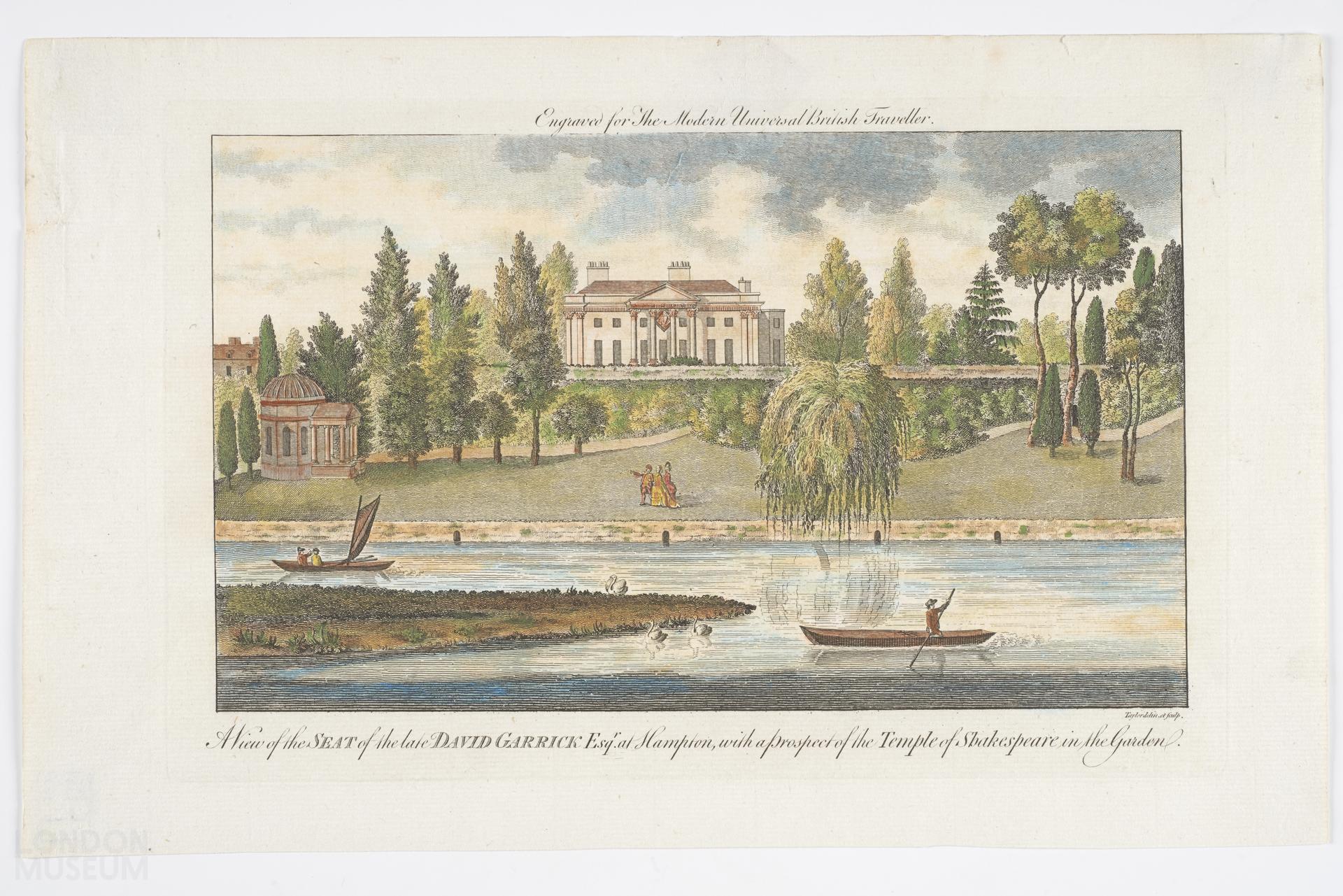 'A view of the Seat of the late David Garrick at Hampton, with prospect of temple of Shakespeare in garden' seen from the river. Hampton House (later Garrick's Villa), Hampton Court Road, Middlesex was aquired by Garrick in 1754. Robert Adams made alterations, including pillars, Garrick built an orangery in the grounds and a Temple to Shakespeare on the river side, reached by a tunnel under the road. On Garrick's death in 1779, his widow Eva remained there until her death in 1822.