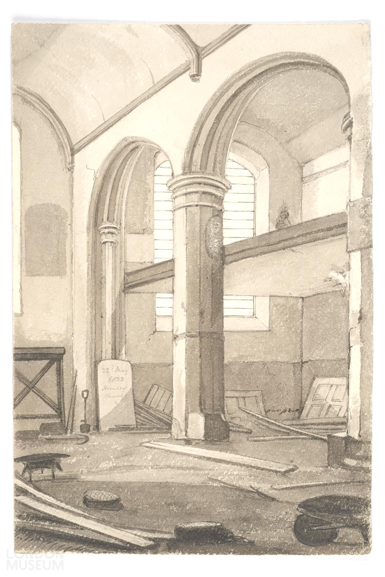 Drawing of 'Hornsey Church' interior,' 22 May 1832' inscribed on a grave stone.