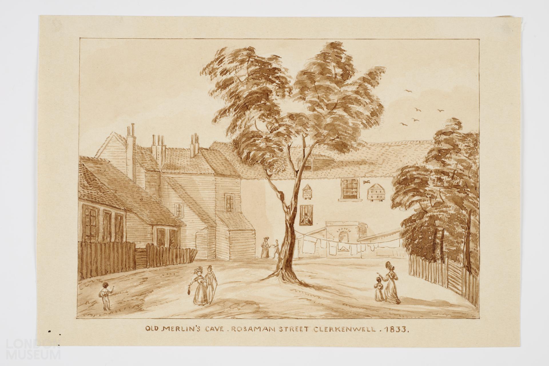 Old Merlin's Cave, Rosaman Street, Clerkenwell 1833. The street takes its name from Thomas Rosoman, proprietor of Sadlers Wells 1736-42.