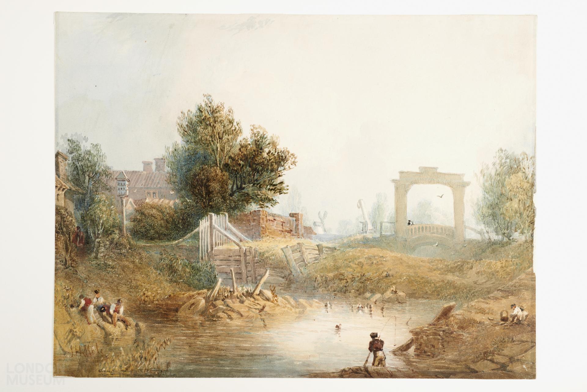 Idealised view of rural Tothill Fields, Westminster with fishermen and figures gatherd around the pond. (Mole - R.I. 1814-86)