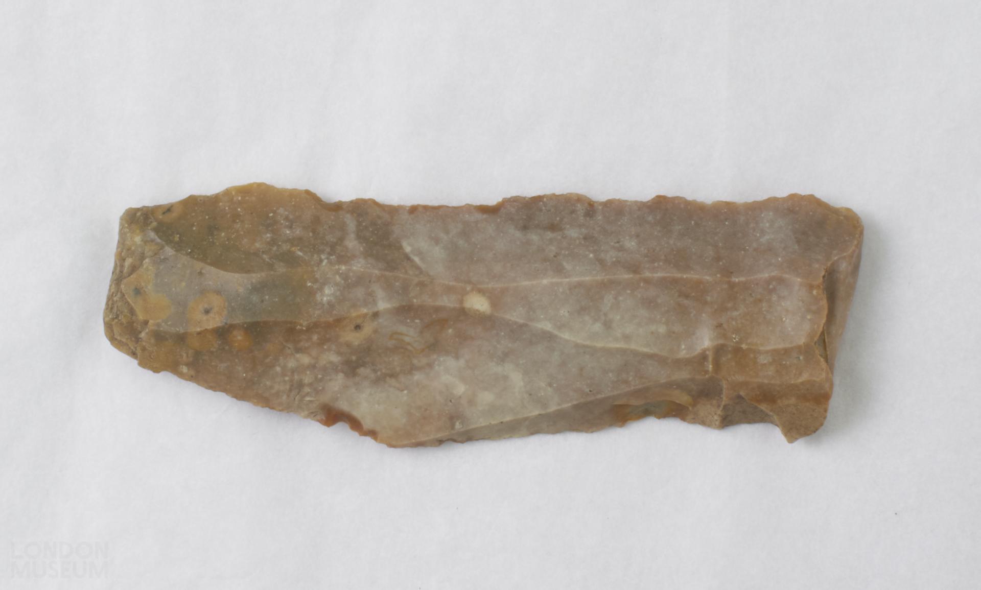 Yellow / ochre lint blade with a plunging hinge fracture.