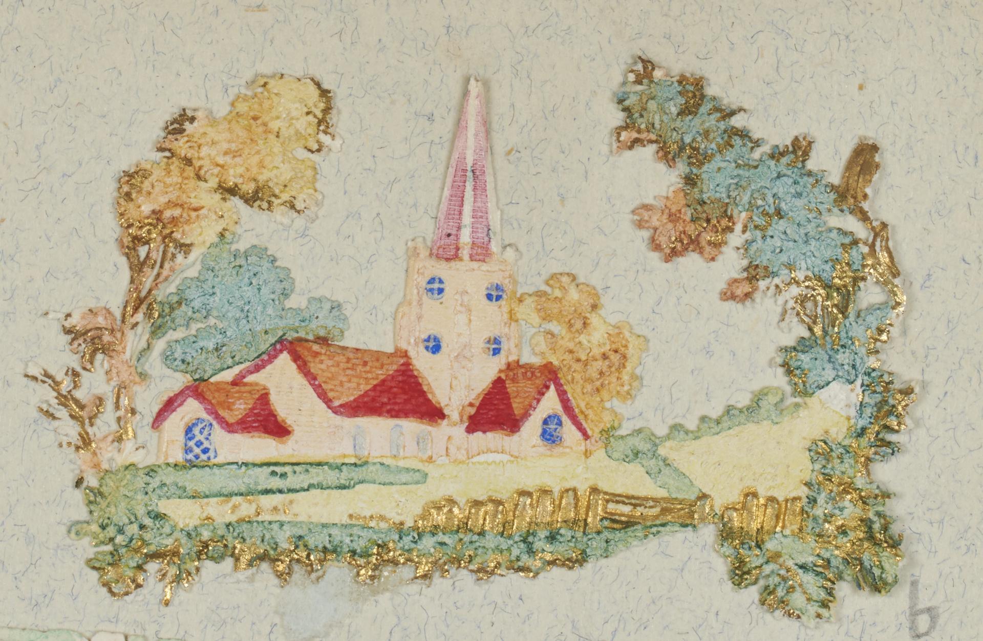 Sheet extracted from a volume of Jonathan King's valentine card collection with the handwritten page no. 'Page 74'. Applied to the sheet are an embossed, handcoloured, cut out paper image of a country church intended as decoration on a valentine's card and an incomplete valentine's card comprising a sheet of lace paper with a central, handcoloured embossed wreath surrounding an open roundel. Above the roundel is an embossed, handcoloured paper image of a country church.