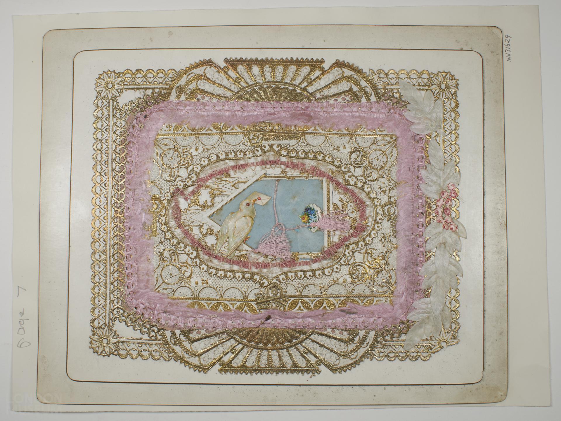 Valentine card with image of a dove with a letter in it's mouth. Below the dove is a bouquet of flowers with the word: 'Friendship'. Bordered with pink textile frill and tassels.