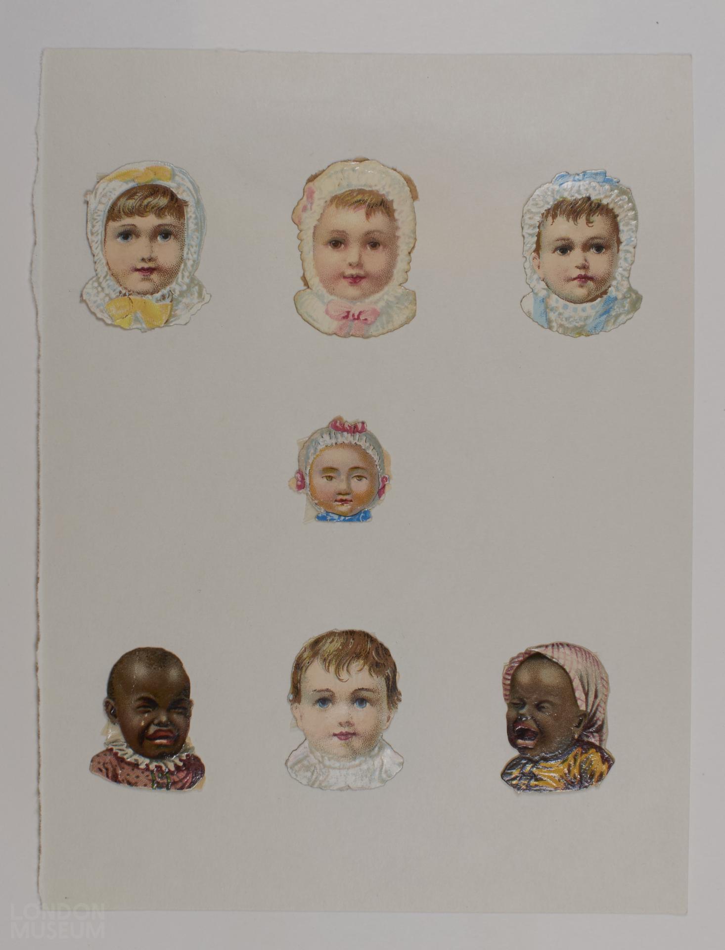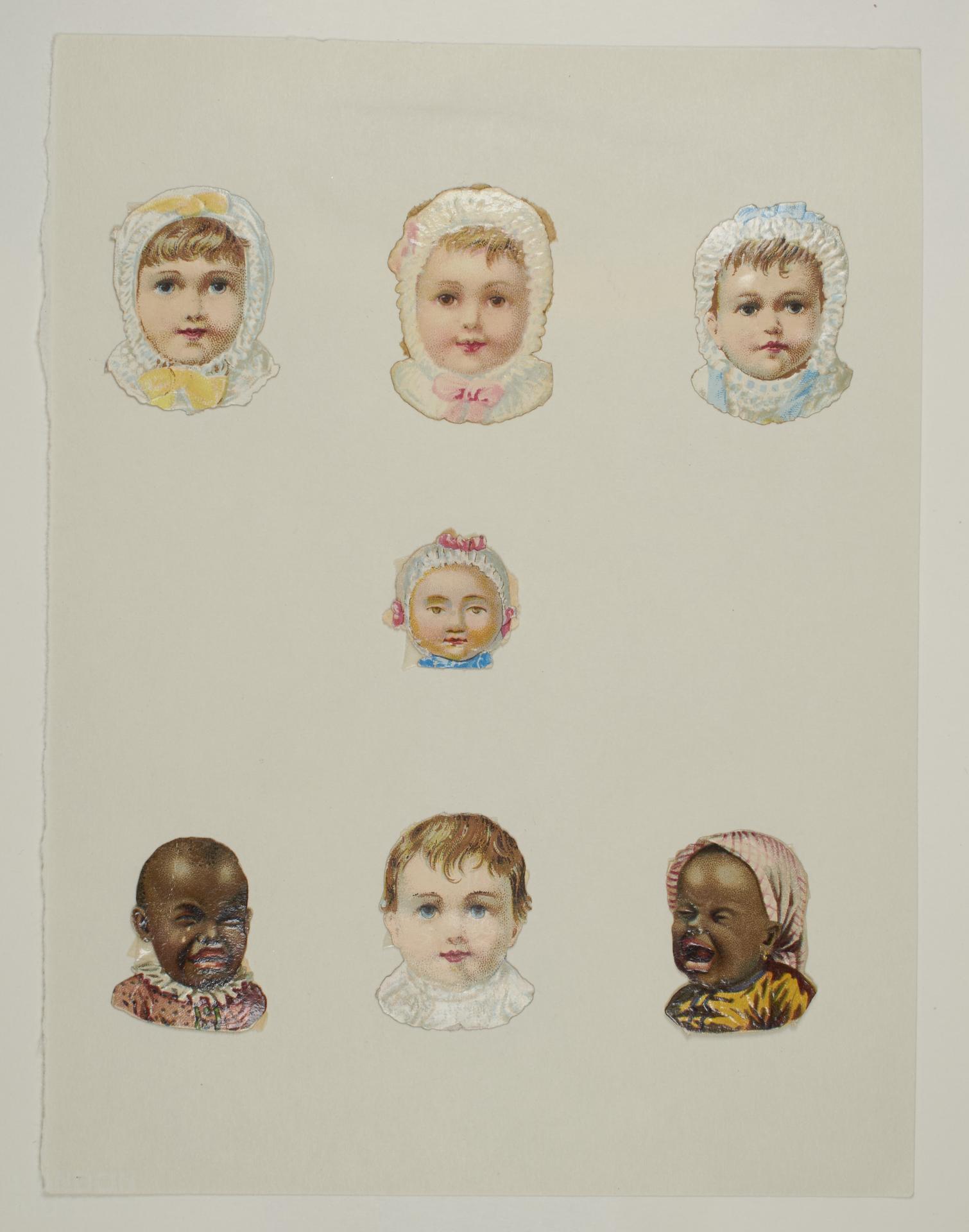 Seven card decorations of the faces of babies including four expressionless white babies and two crying black babies. This item is within a box of items related to the Jonathan King Valentine card collection.