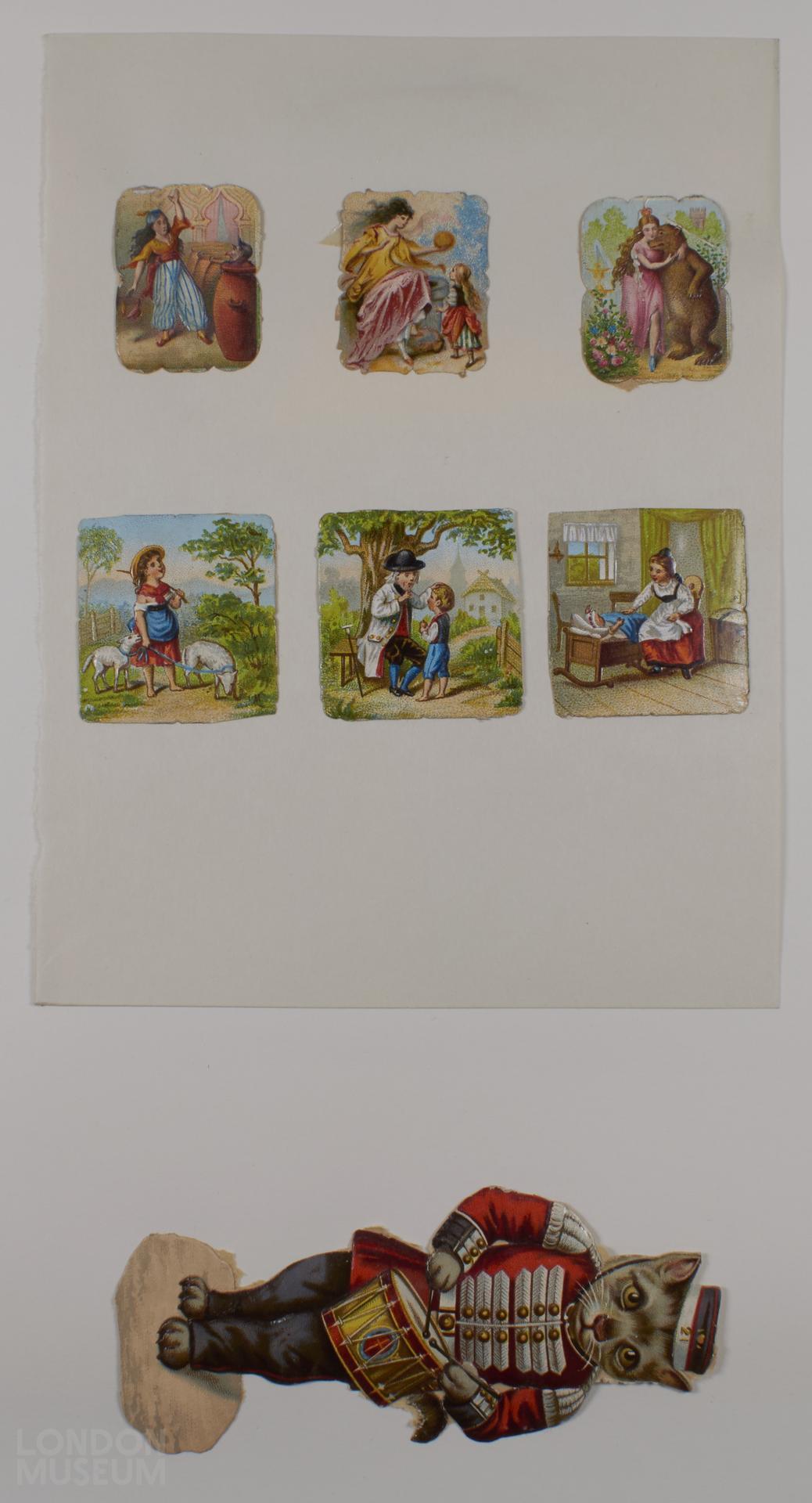 Seven card decorations including six square shaped decorations depicting scenes including a women being surprised by a man in a vase, a women with a bear and a young girl with two sheep. The seventh decoration is a cat dressed in a red uniform playing a drum. This item is within a box of items related to the Jonathan King Valentine card collection.