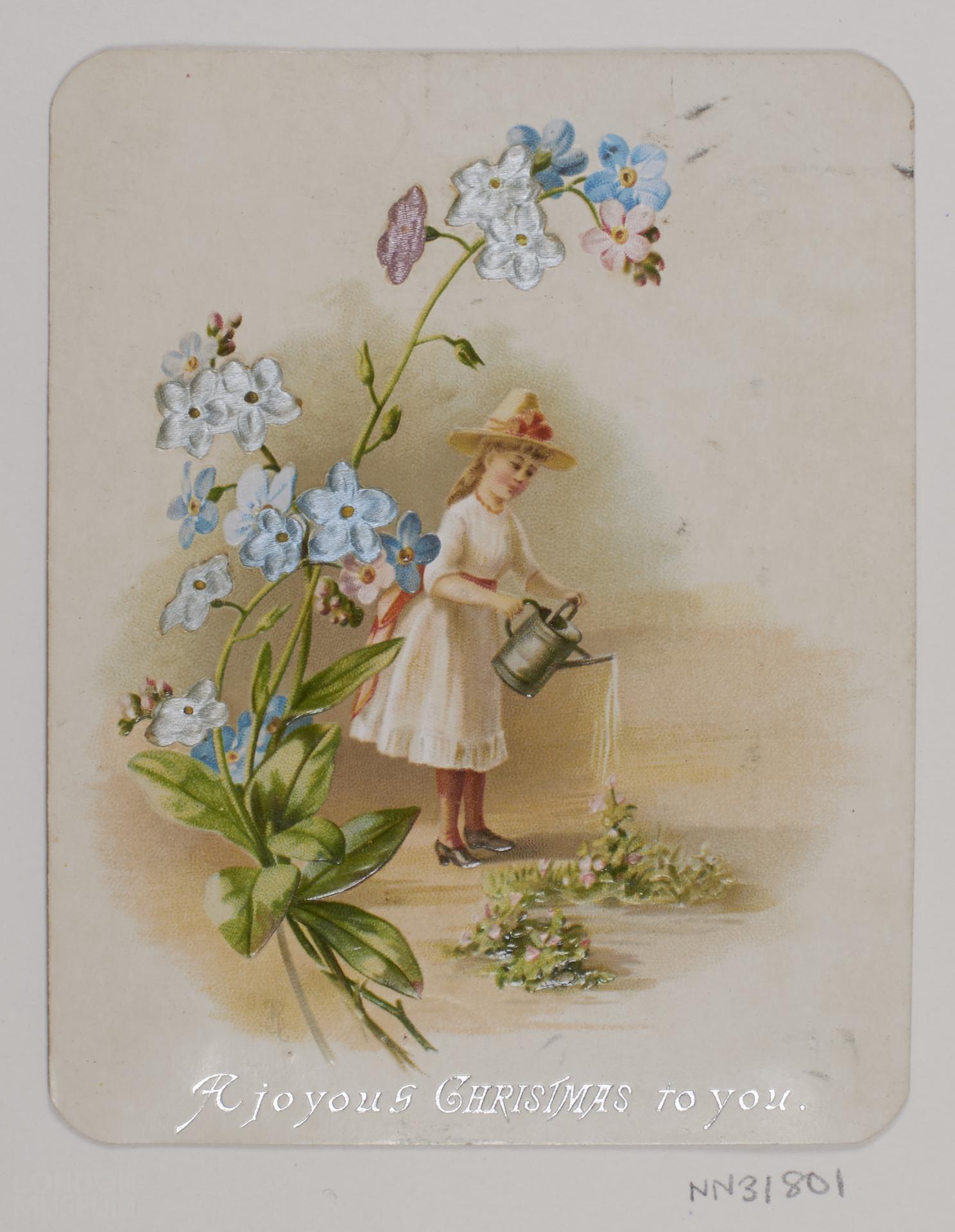 Christmas card, with colour printed ink image depicting a female figure watering plants. With blue coloured flowers embossed around. This item is within a box of items related to the Jonathan King Valentine card collection.