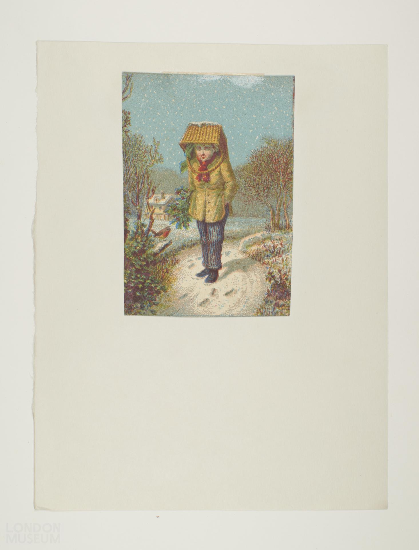 One card decoration depicting a male figure walking through the snow with a basket on his head. This item is within a box of items related to the Jonathan King Valentine card collection.