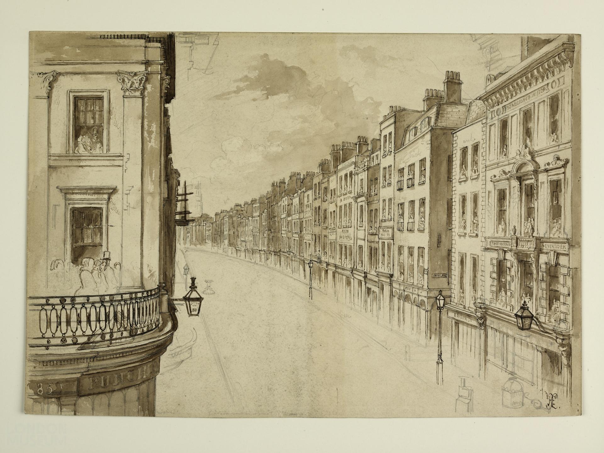 Sketched with a pen in ink over pencil outlines, with shading and clouds in ink wash, this sketch shows a view east along Fleet Street on the occasion of the Duke of Wellington’s funeral, 18 November 1852. Although the crowd and procession are not included (the street has been left blank) there are several figures standing on balconies and at windows to watch the event. The corner building at the left is the offices of Punch magazine, at 85 Fleet Street.