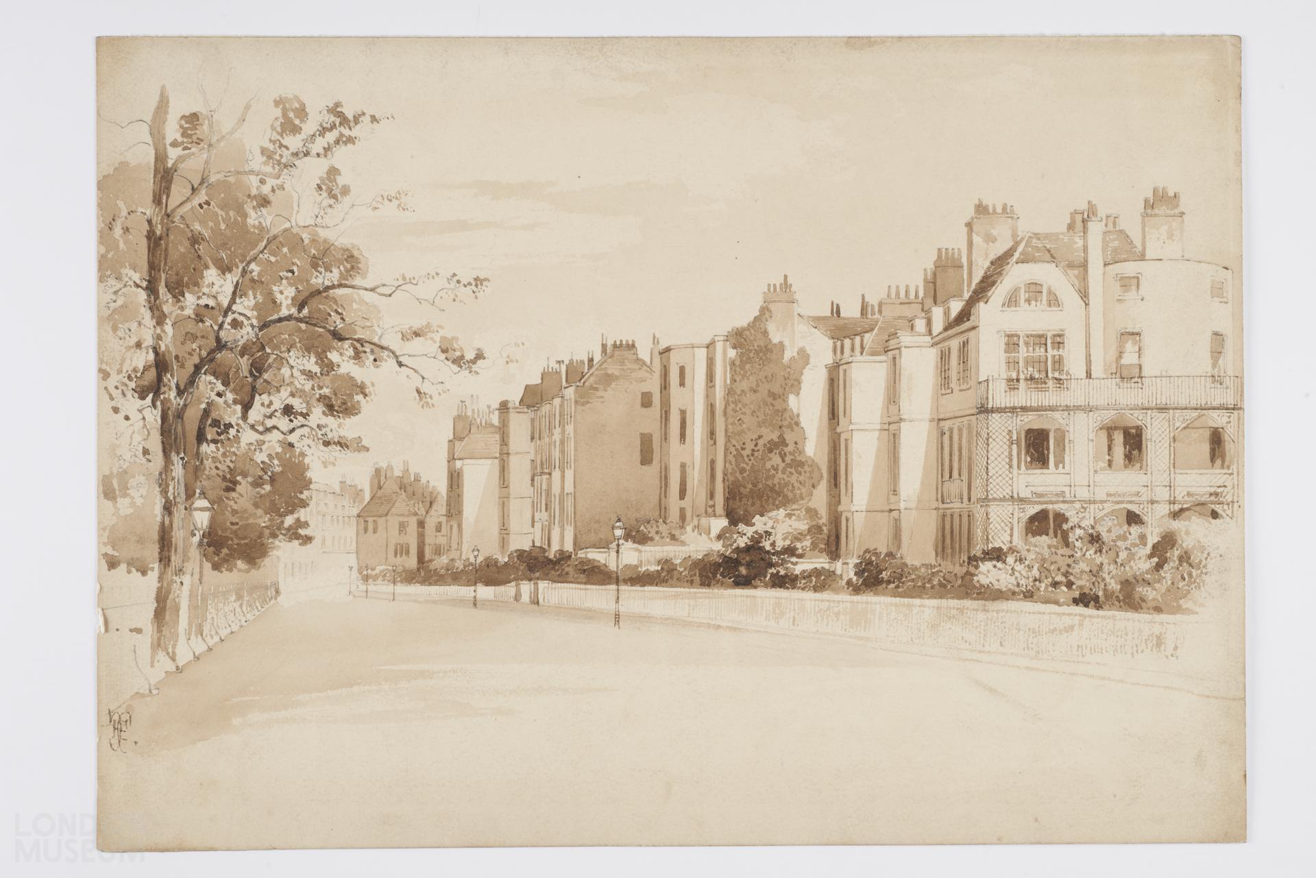 Sketch of Birdcage Walk, drawn at the time of the Duke of Wellington's Funeral, 18 November 1852. Pencil sketch on reverse.